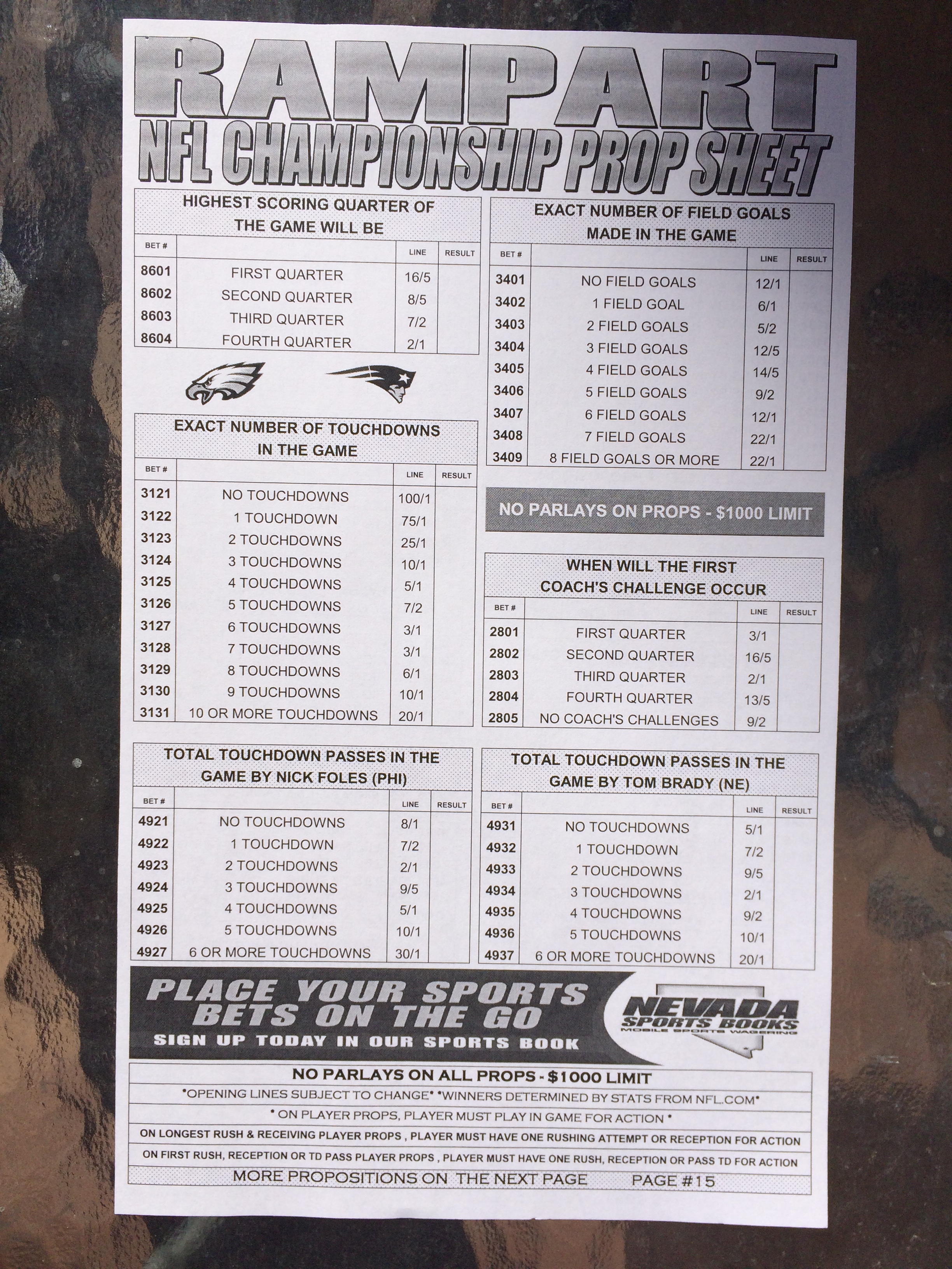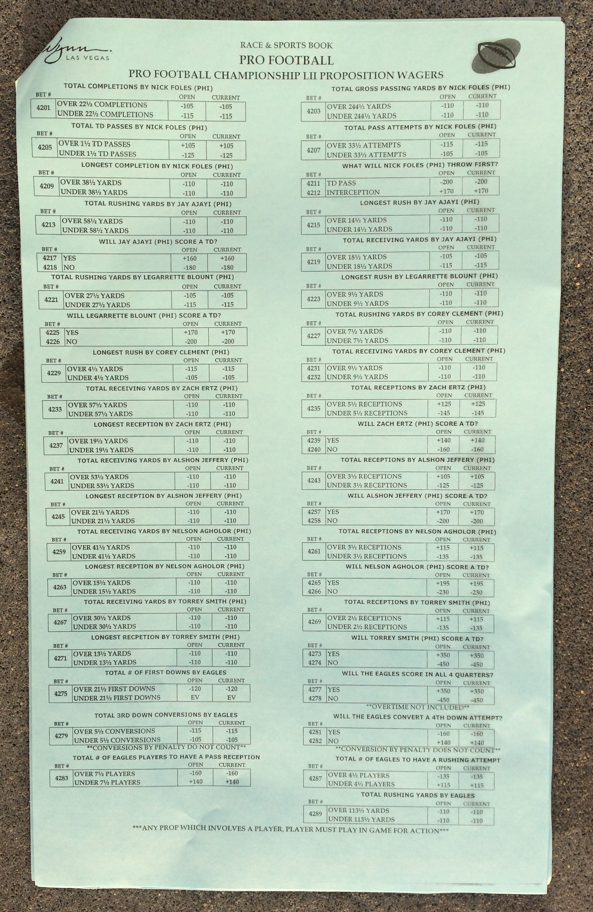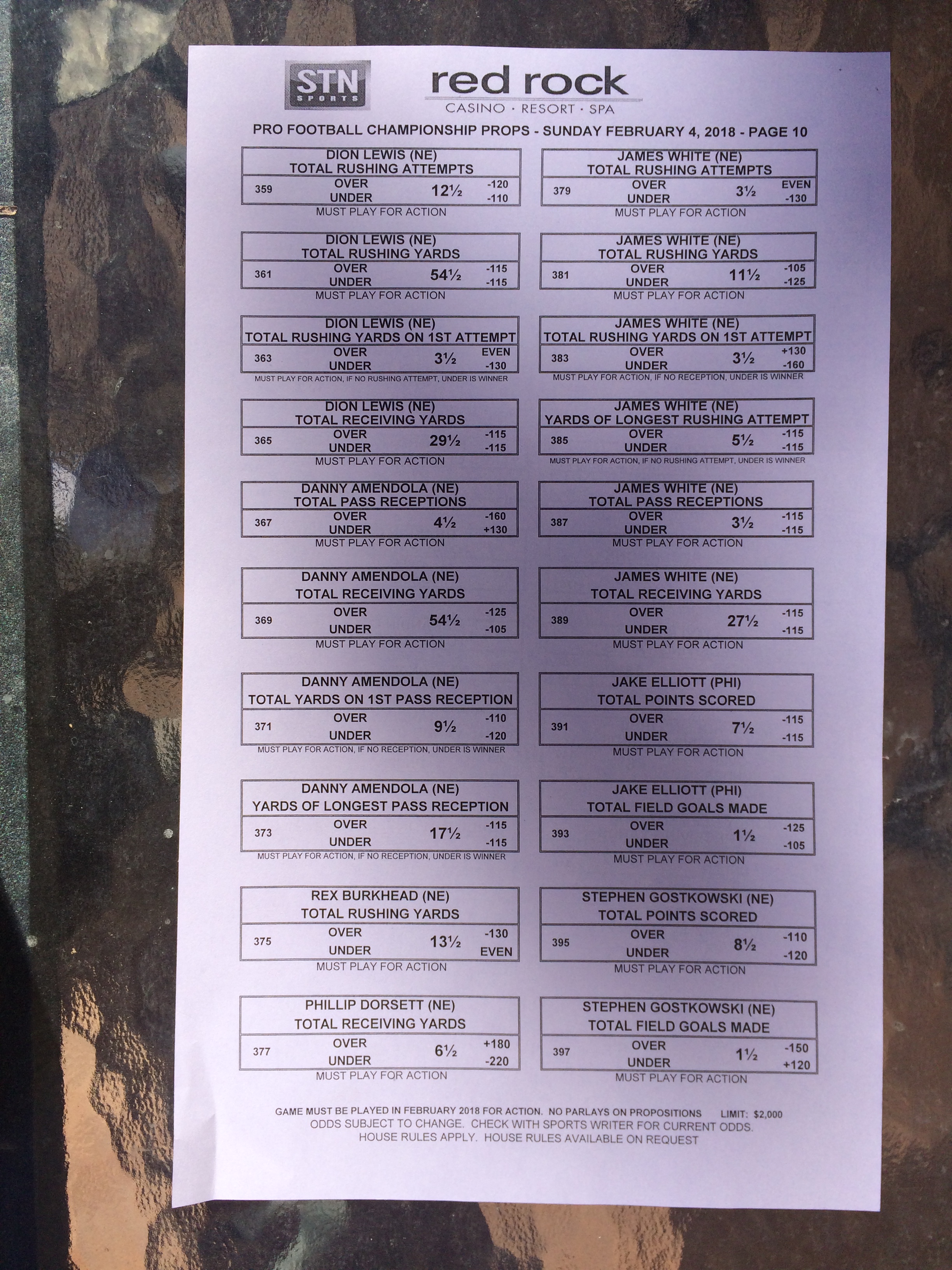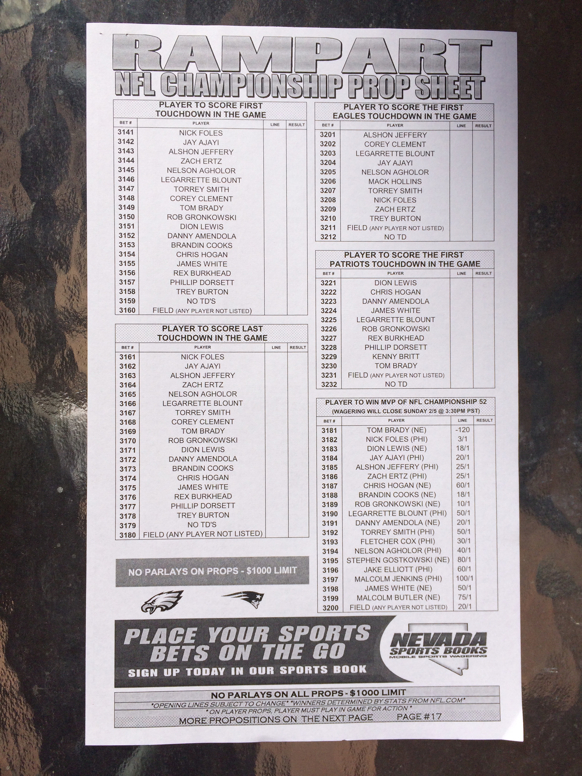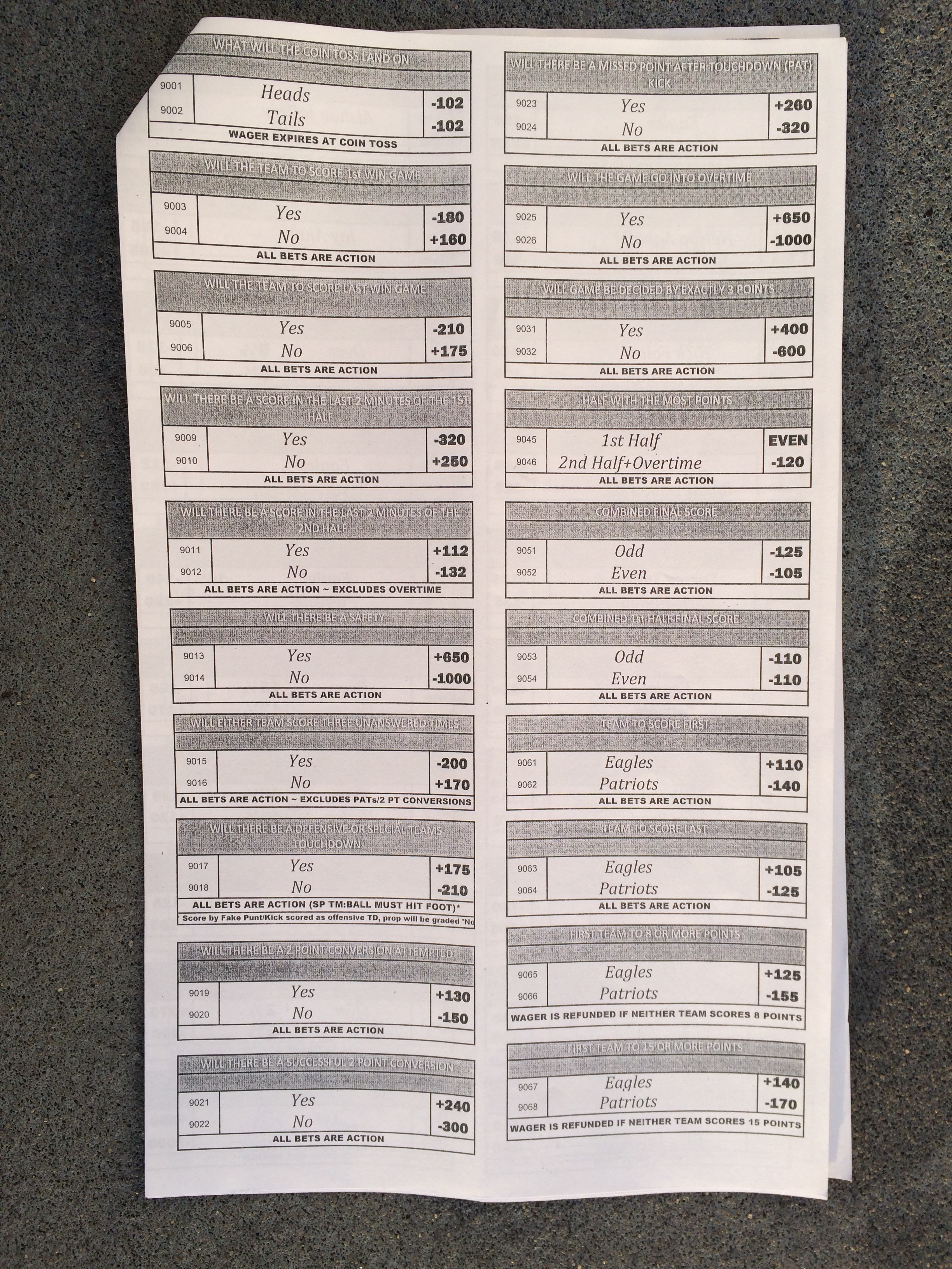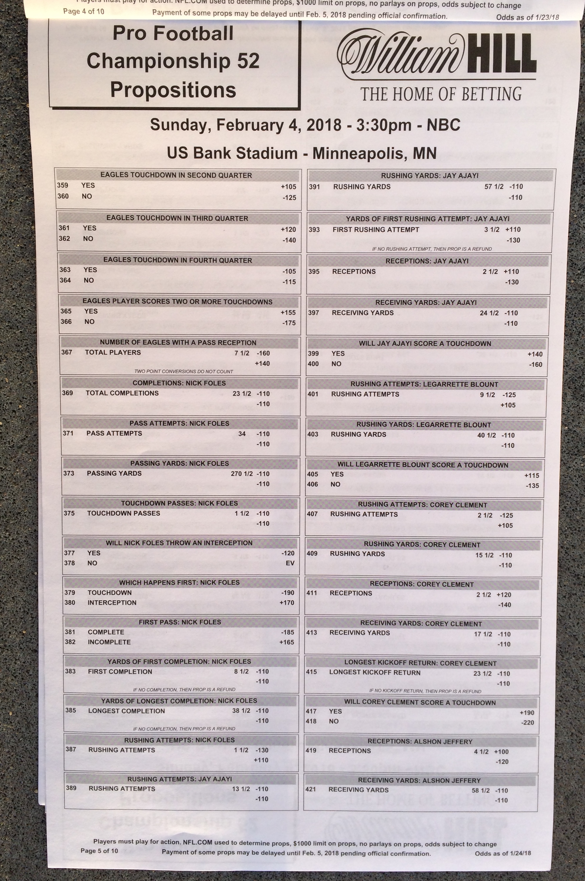 فيما يلي صور لكل صفحة من صفحات رهانات الاقتراحات لدى عدة مكاتب مراهنات رياضية في لاس فيغاس. جُمعت هذه الأوراق في ٢٧ يناير ٢٠١٨، أي قبل ثمانية أيام من المباراة.