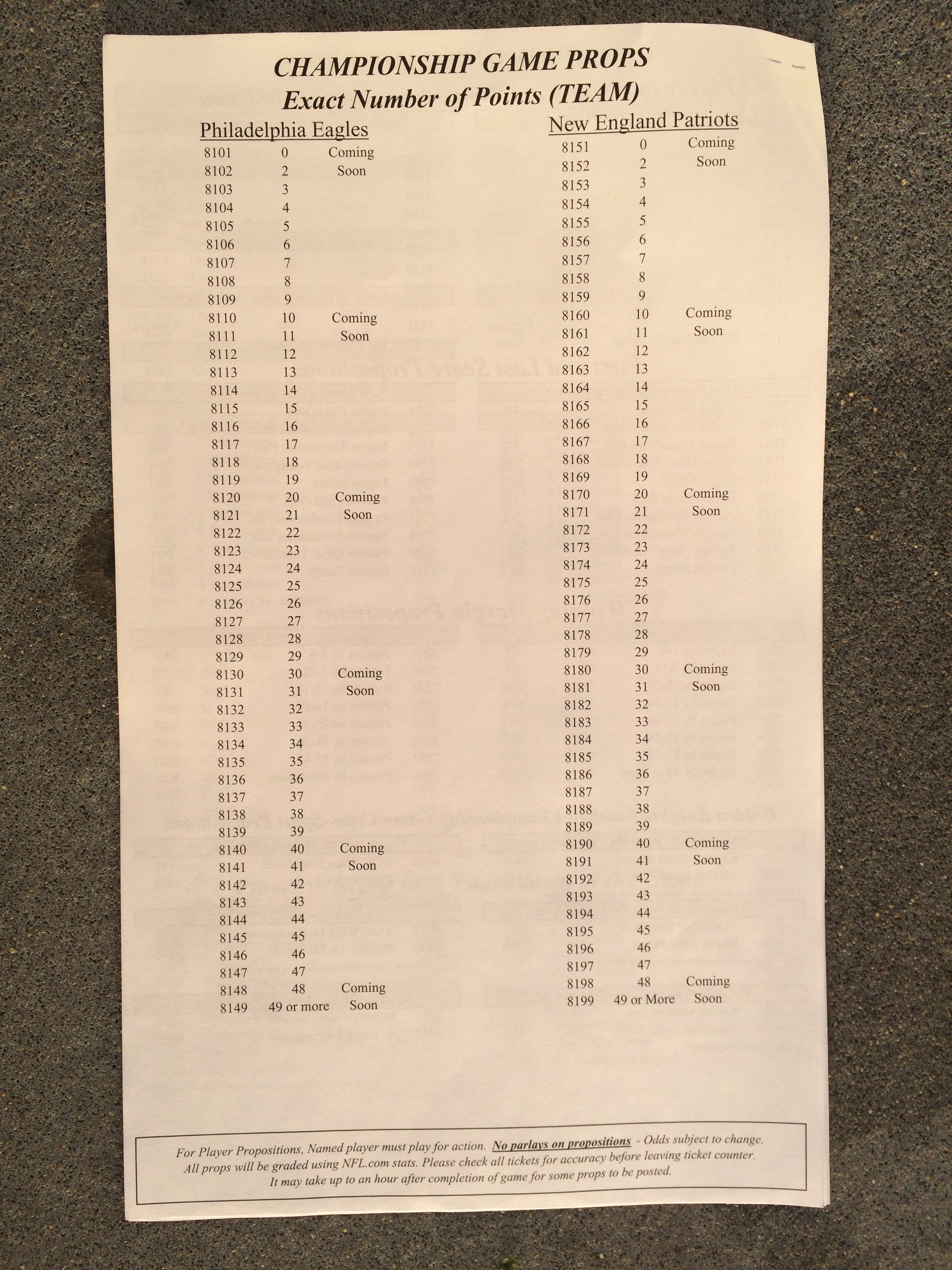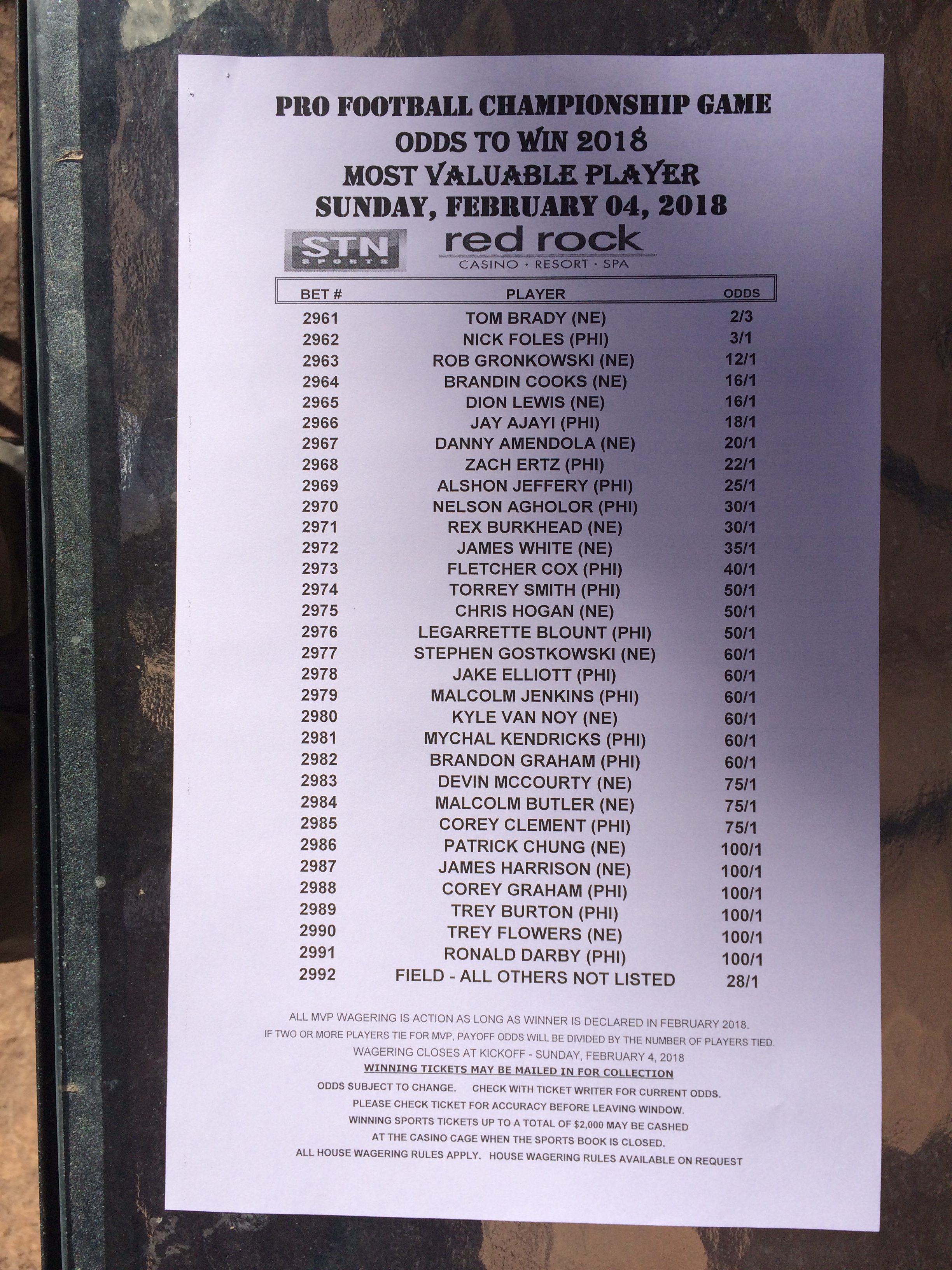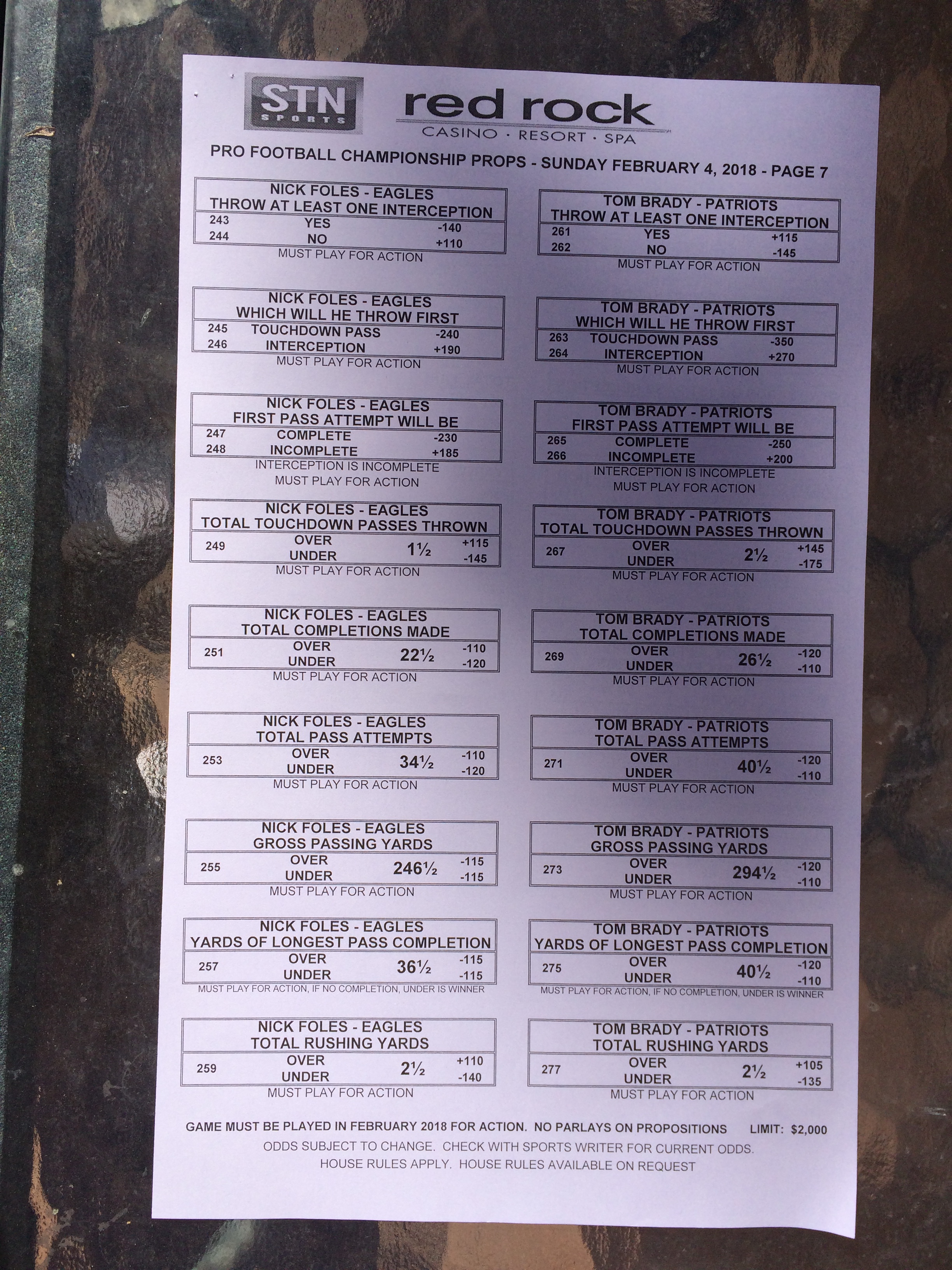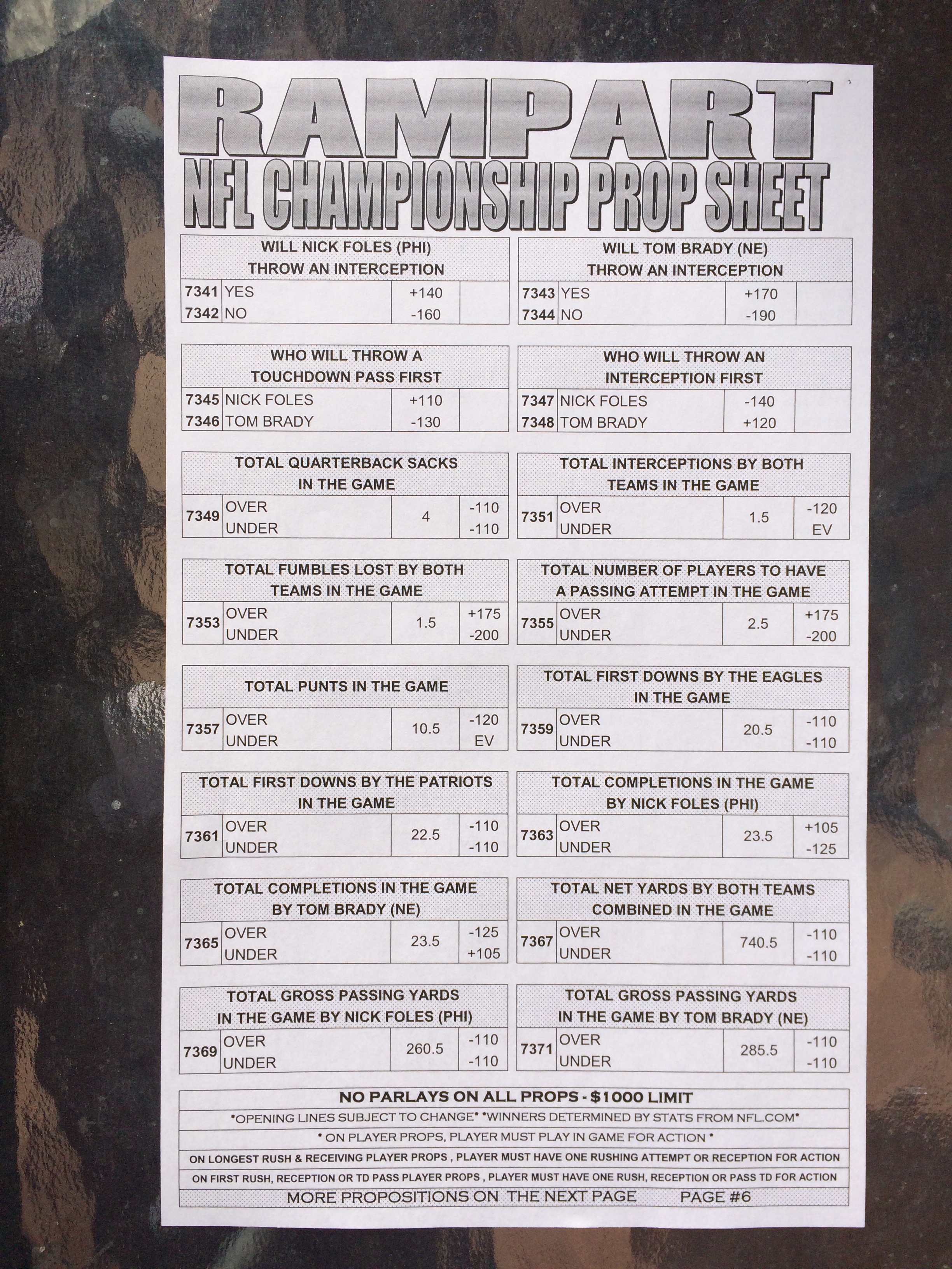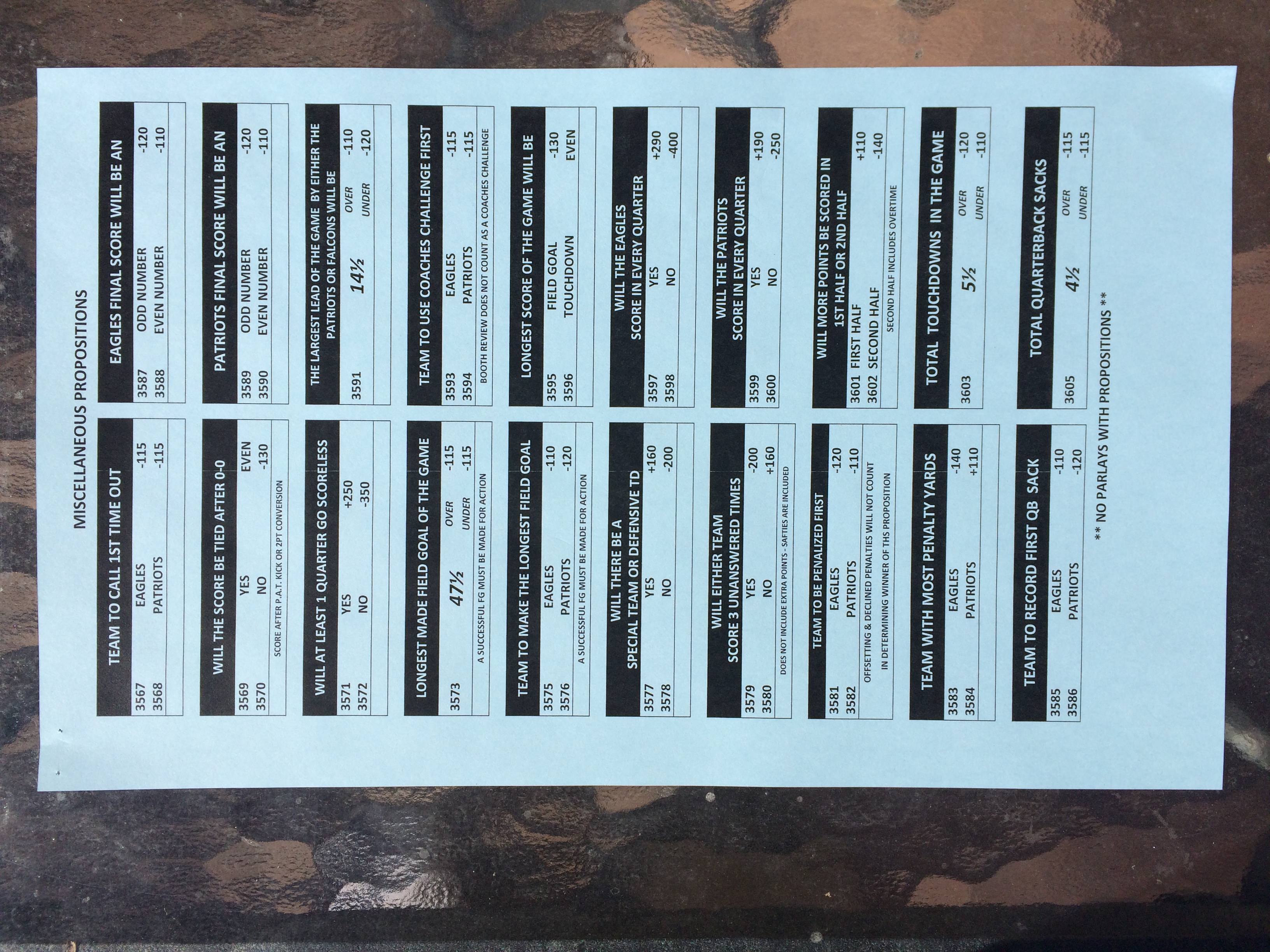 فيما يلي صور لكل صفحة من صفحات رهانات الاقتراحات لدى عدة مكاتب مراهنات رياضية في لاس فيغاس. جُمعت هذه الأوراق في ٢٧ يناير ٢٠١٨، أي قبل ثمانية أيام من المباراة.