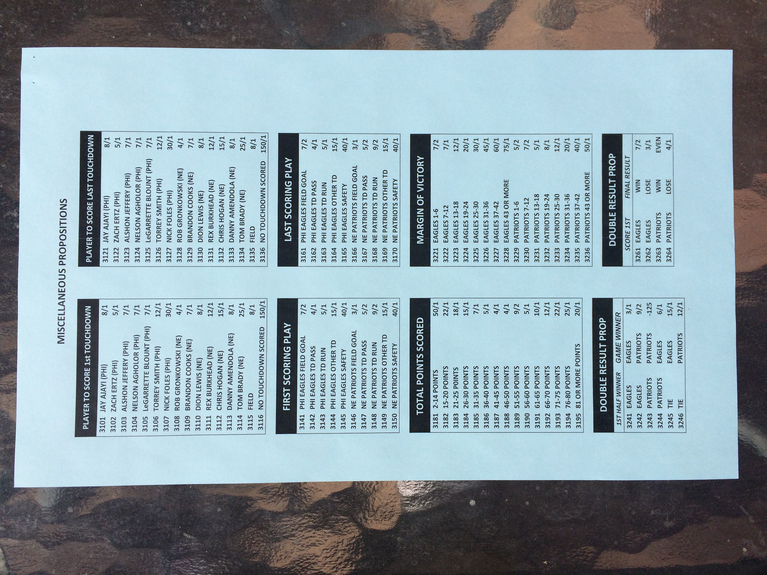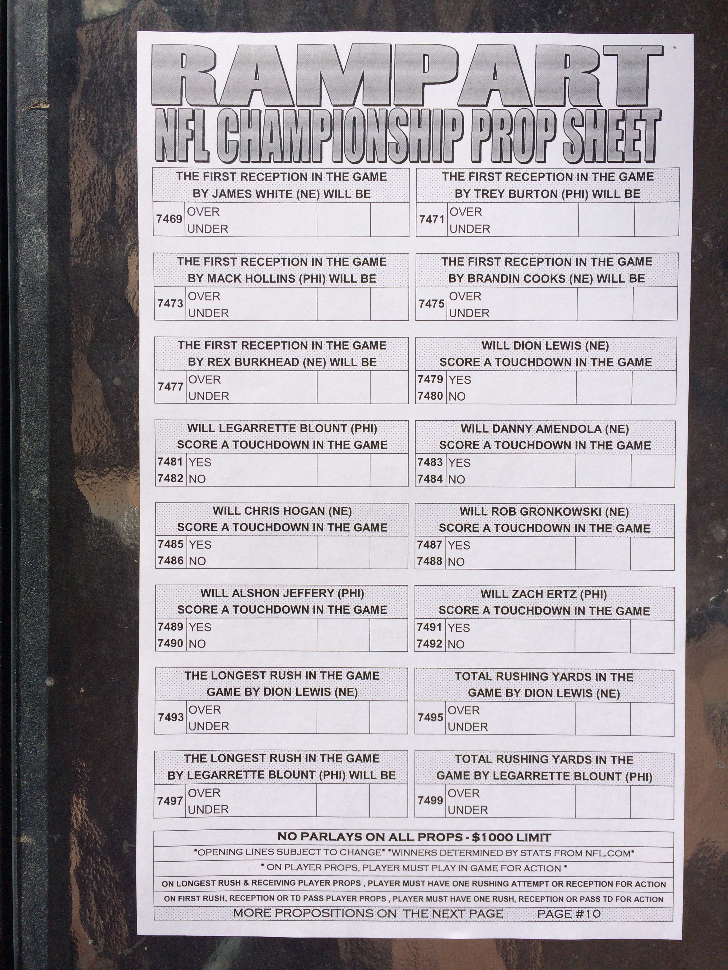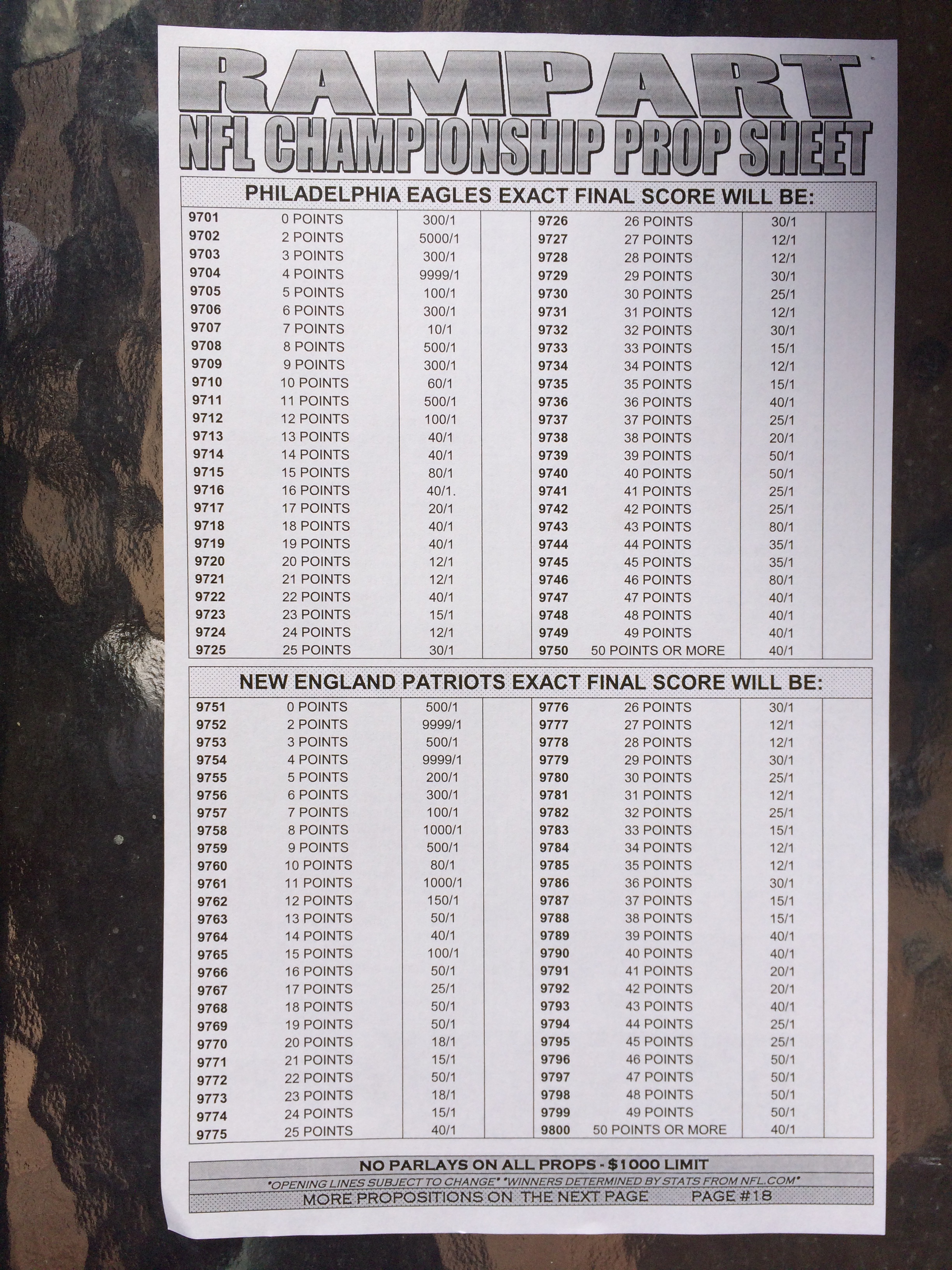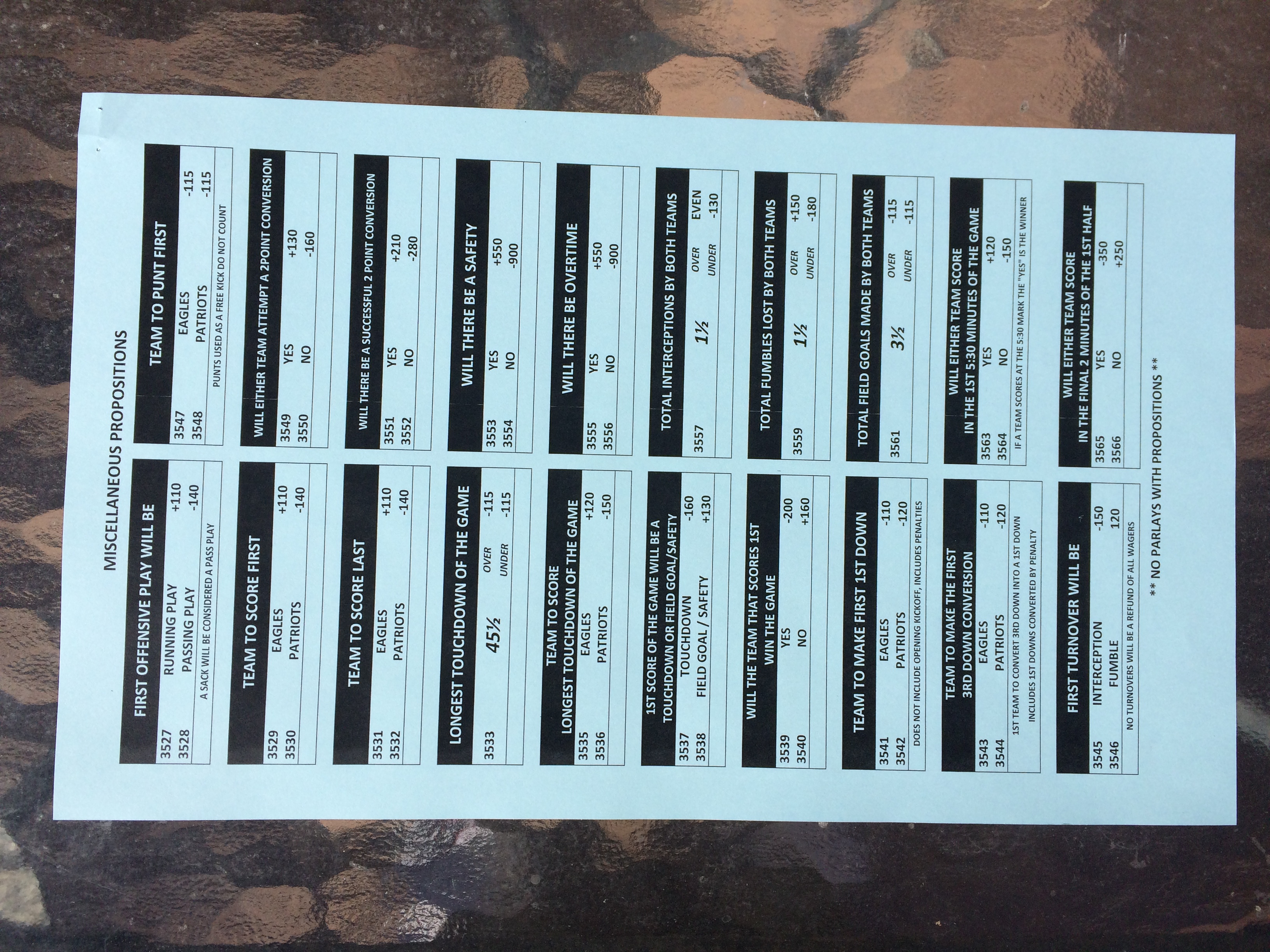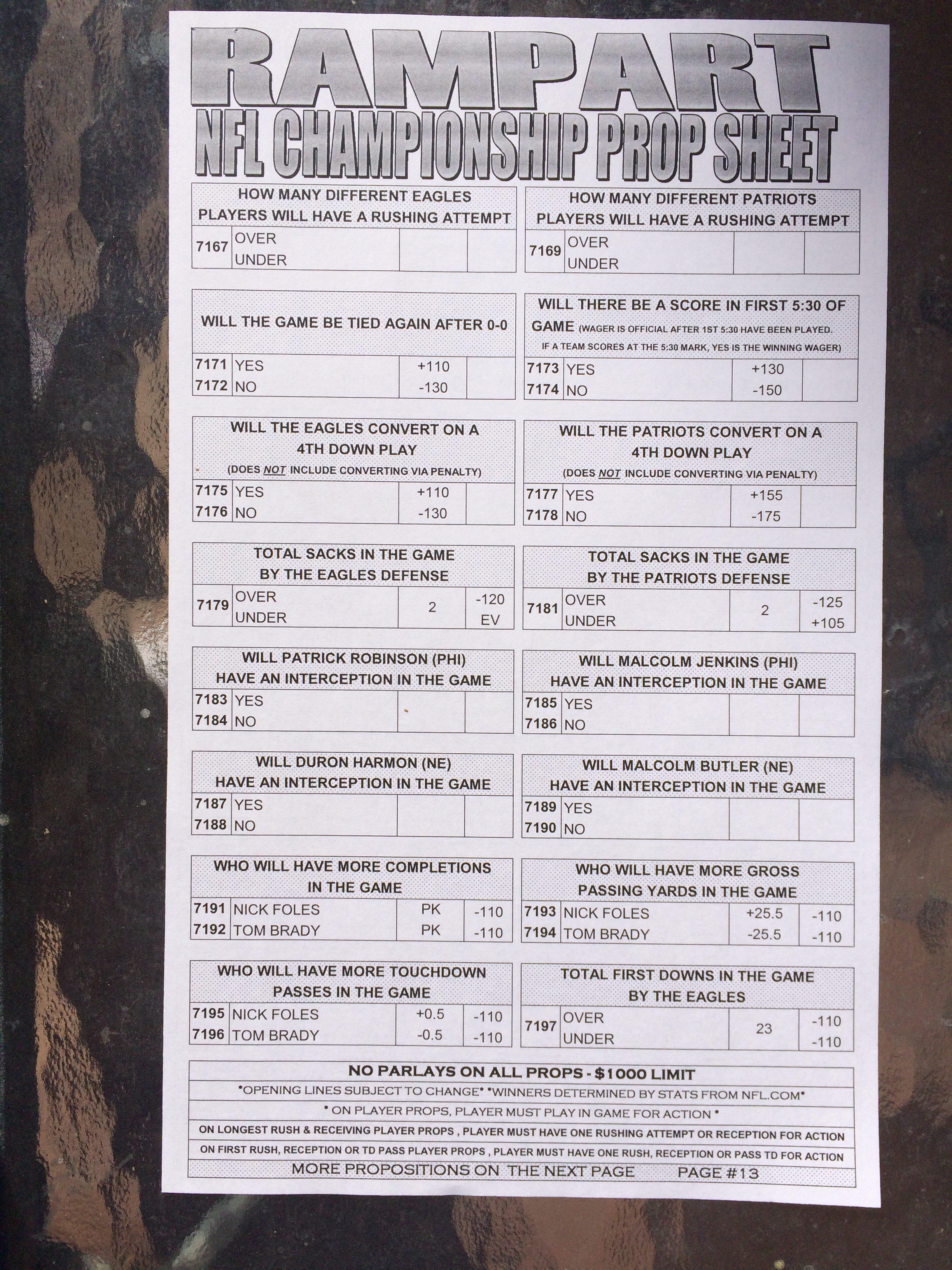 فيما يلي صور لكل صفحة من صفحات رهانات الاقتراحات لدى عدة مكاتب مراهنات رياضية في لاس فيغاس. جُمعت هذه الأوراق في ٢٧ يناير ٢٠١٨، أي قبل ثمانية أيام من المباراة.