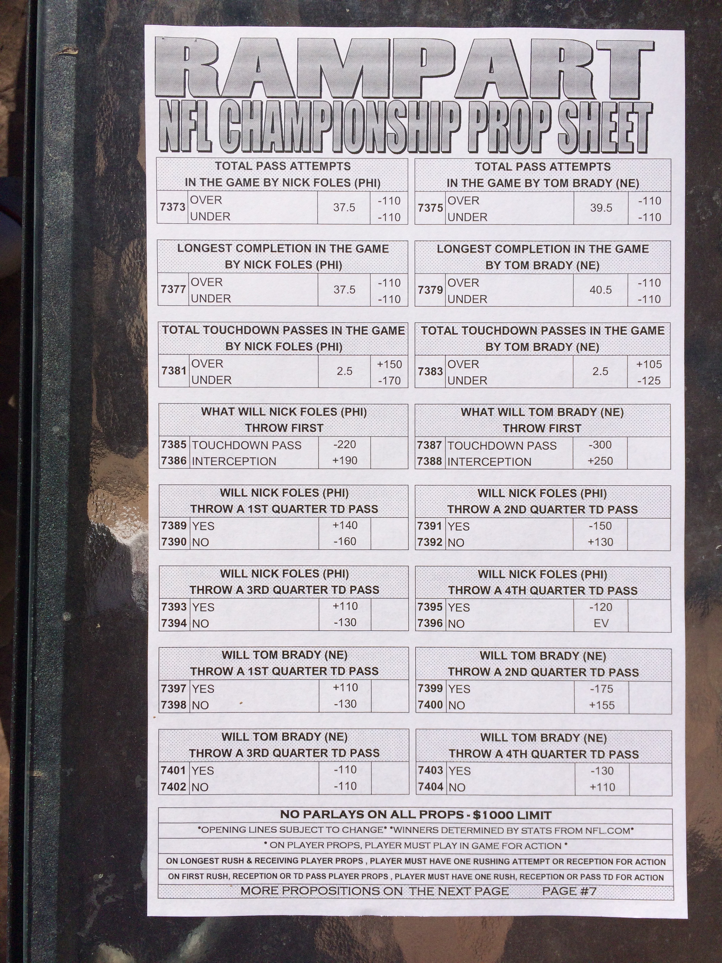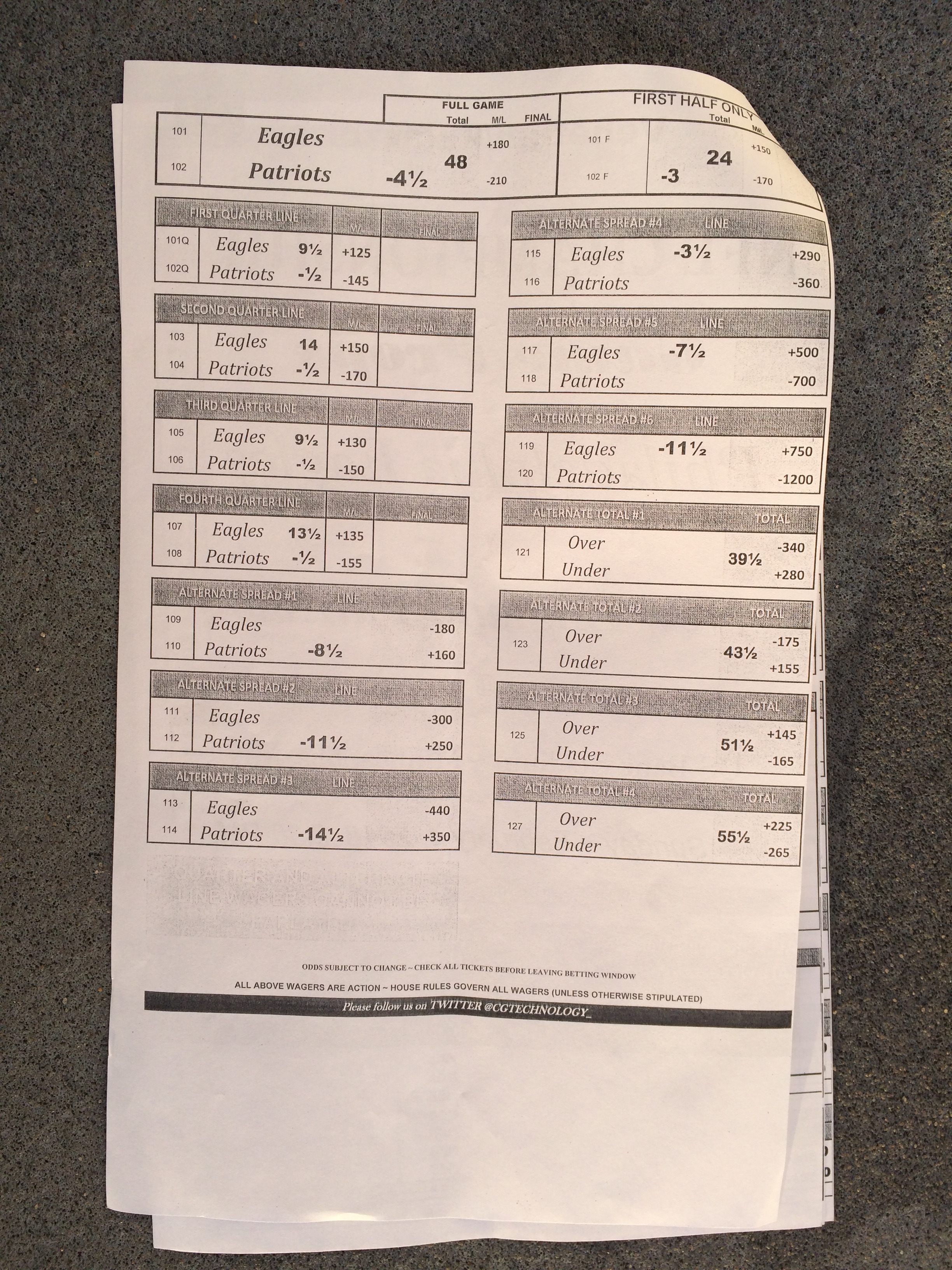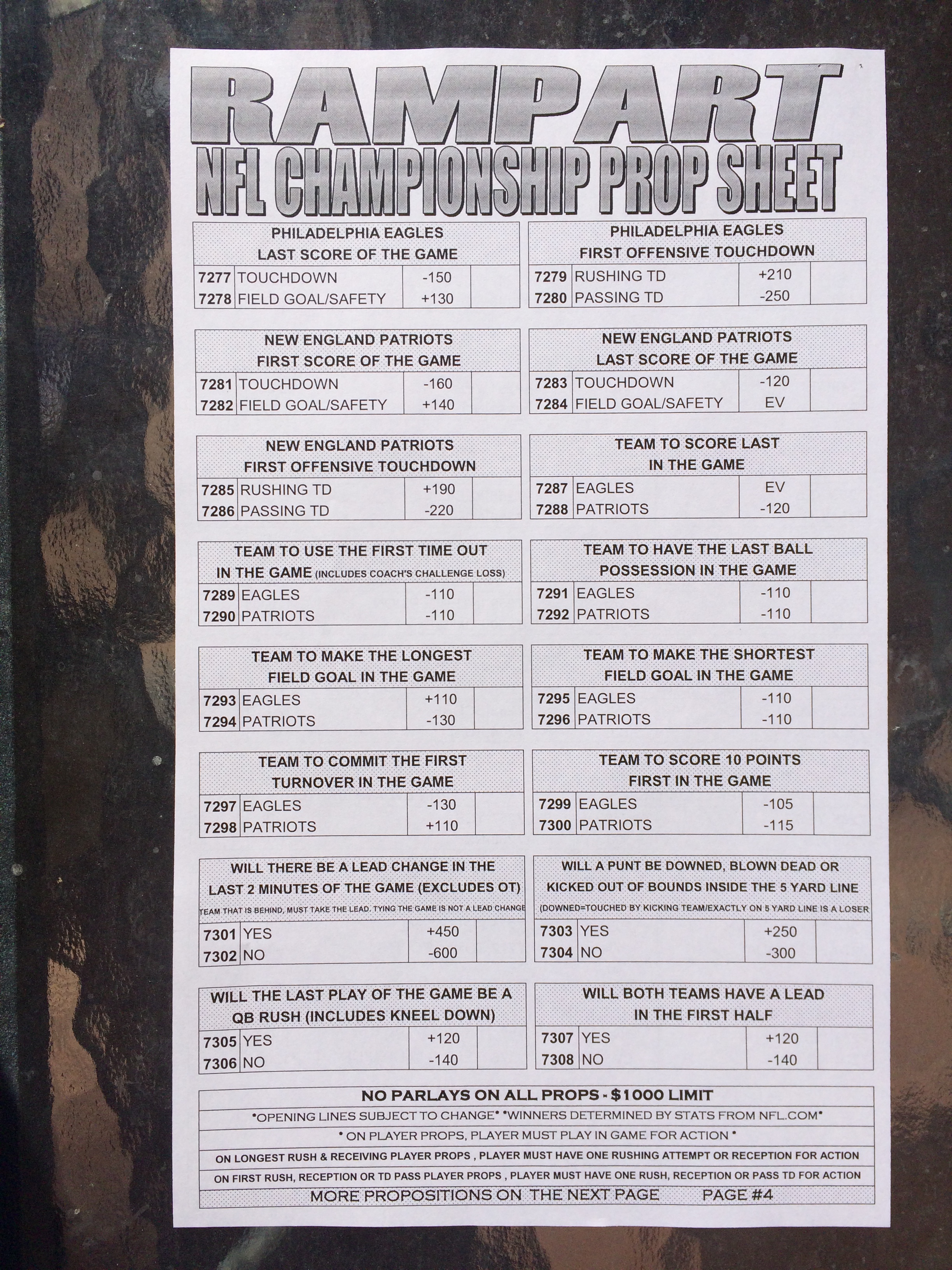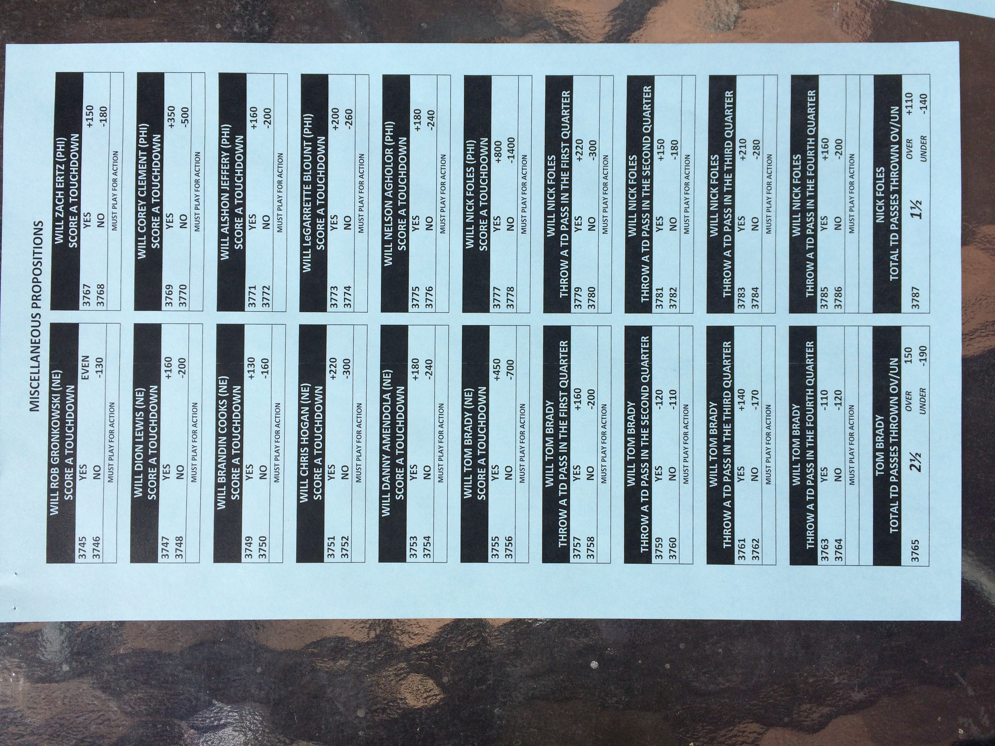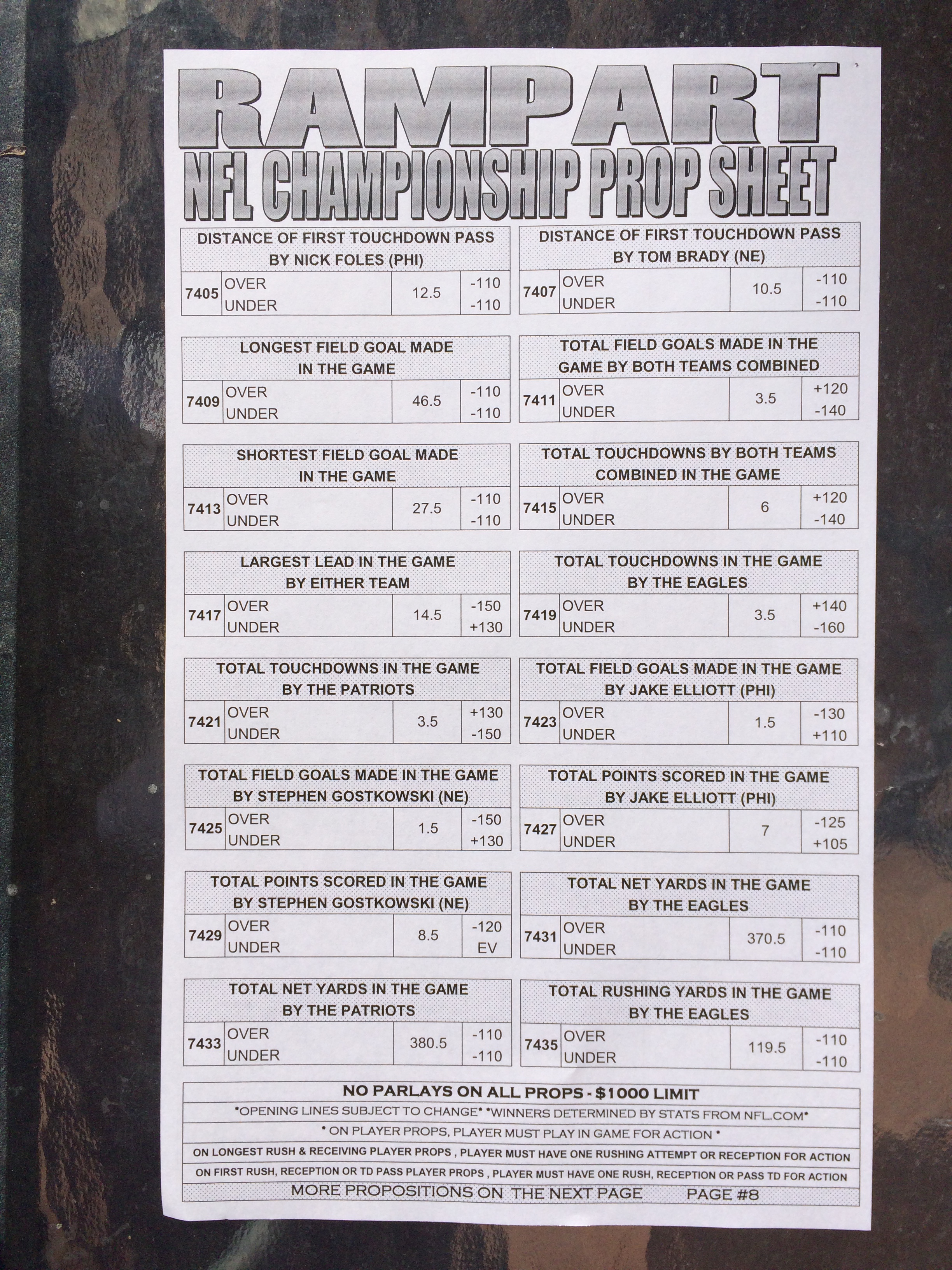 فيما يلي صور لكل صفحة من صفحات رهانات الاقتراحات لدى عدة مكاتب مراهنات رياضية في لاس فيغاس. جُمعت هذه الأوراق في ٢٧ يناير ٢٠١٨، أي قبل ثمانية أيام من المباراة.