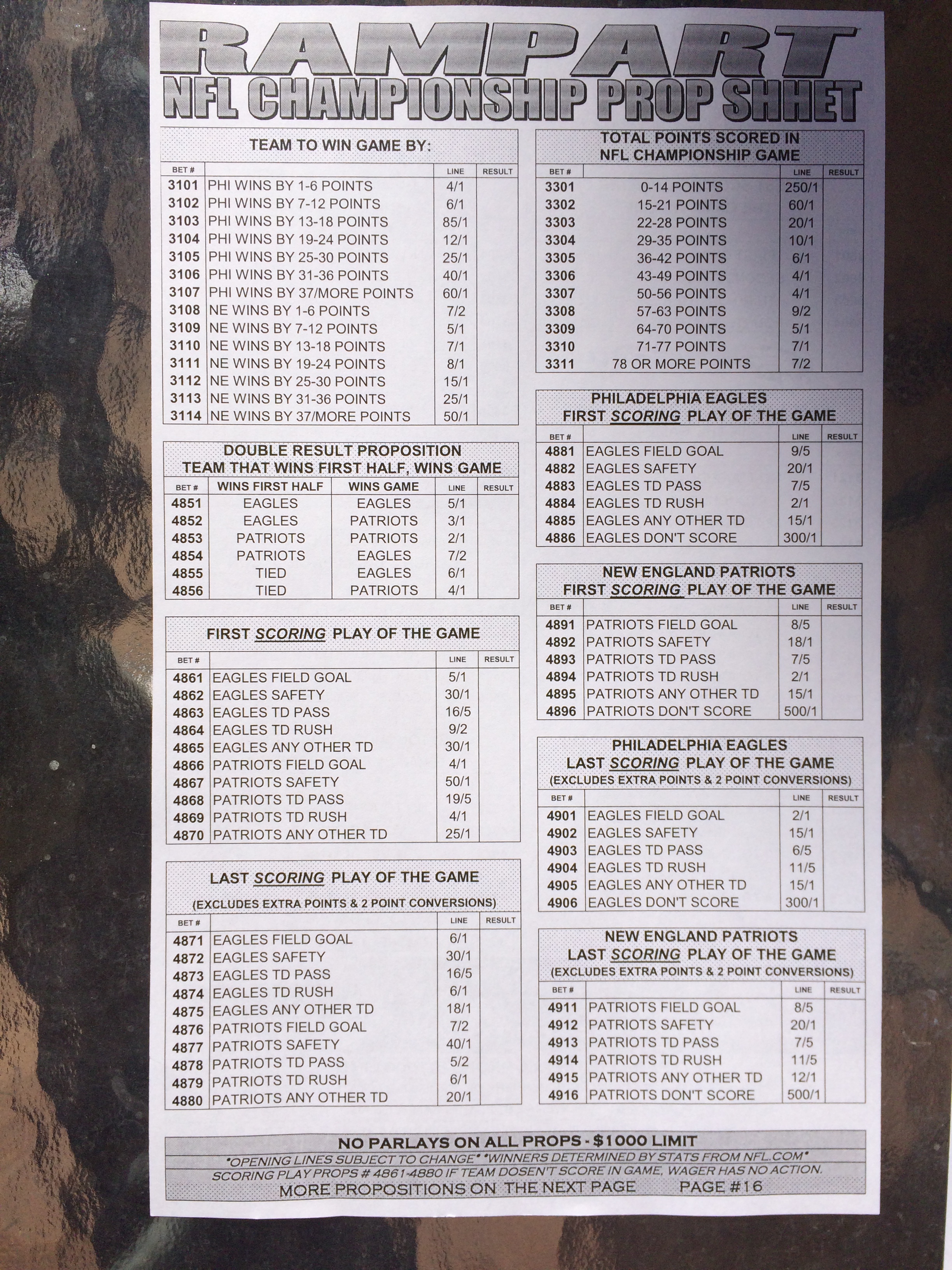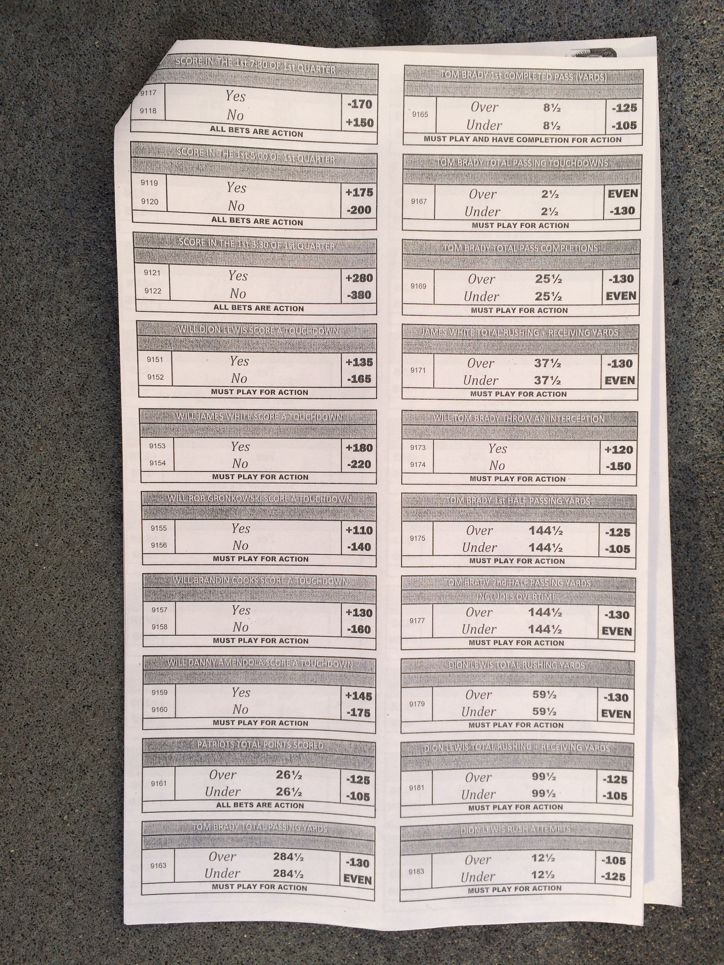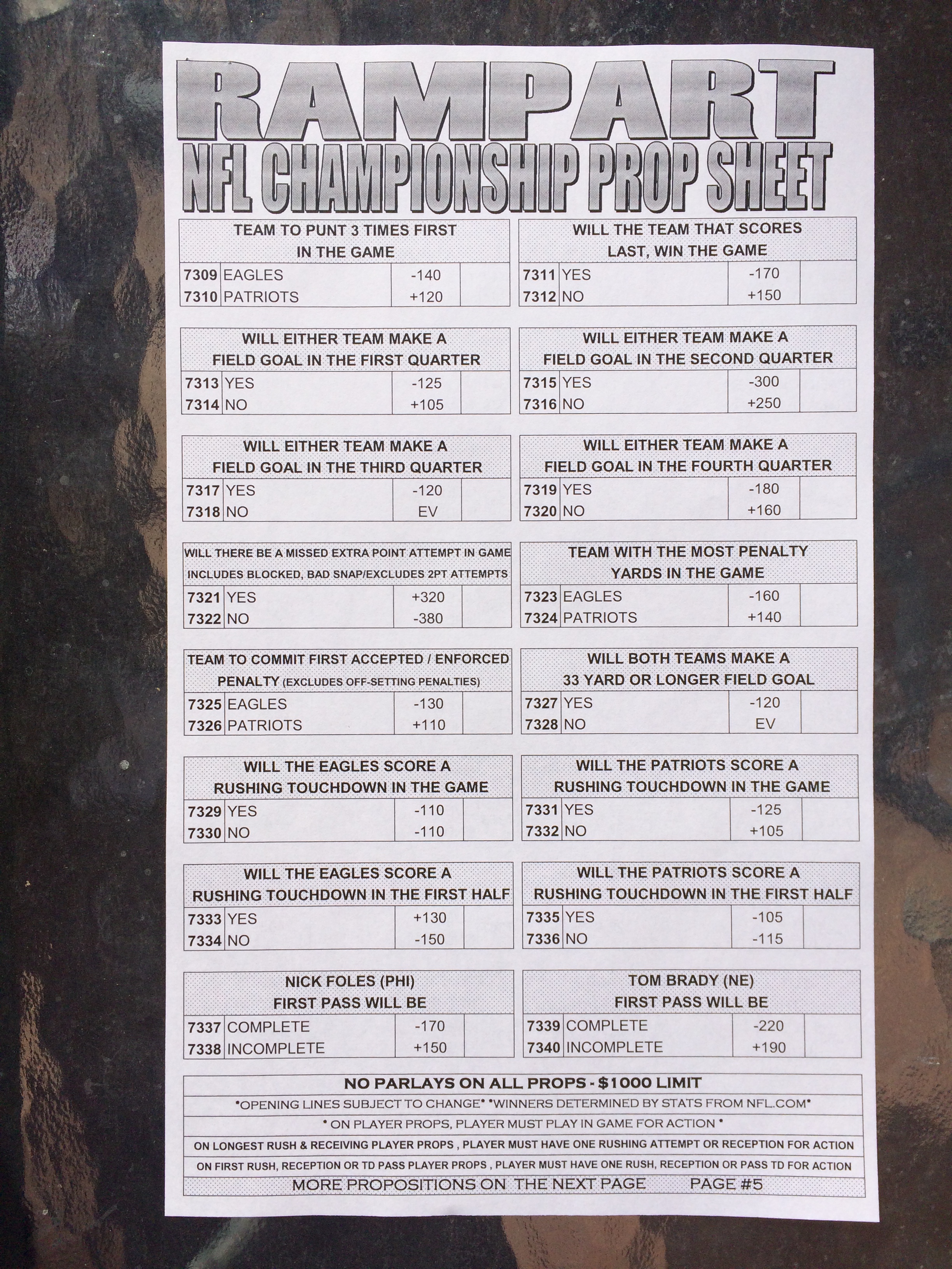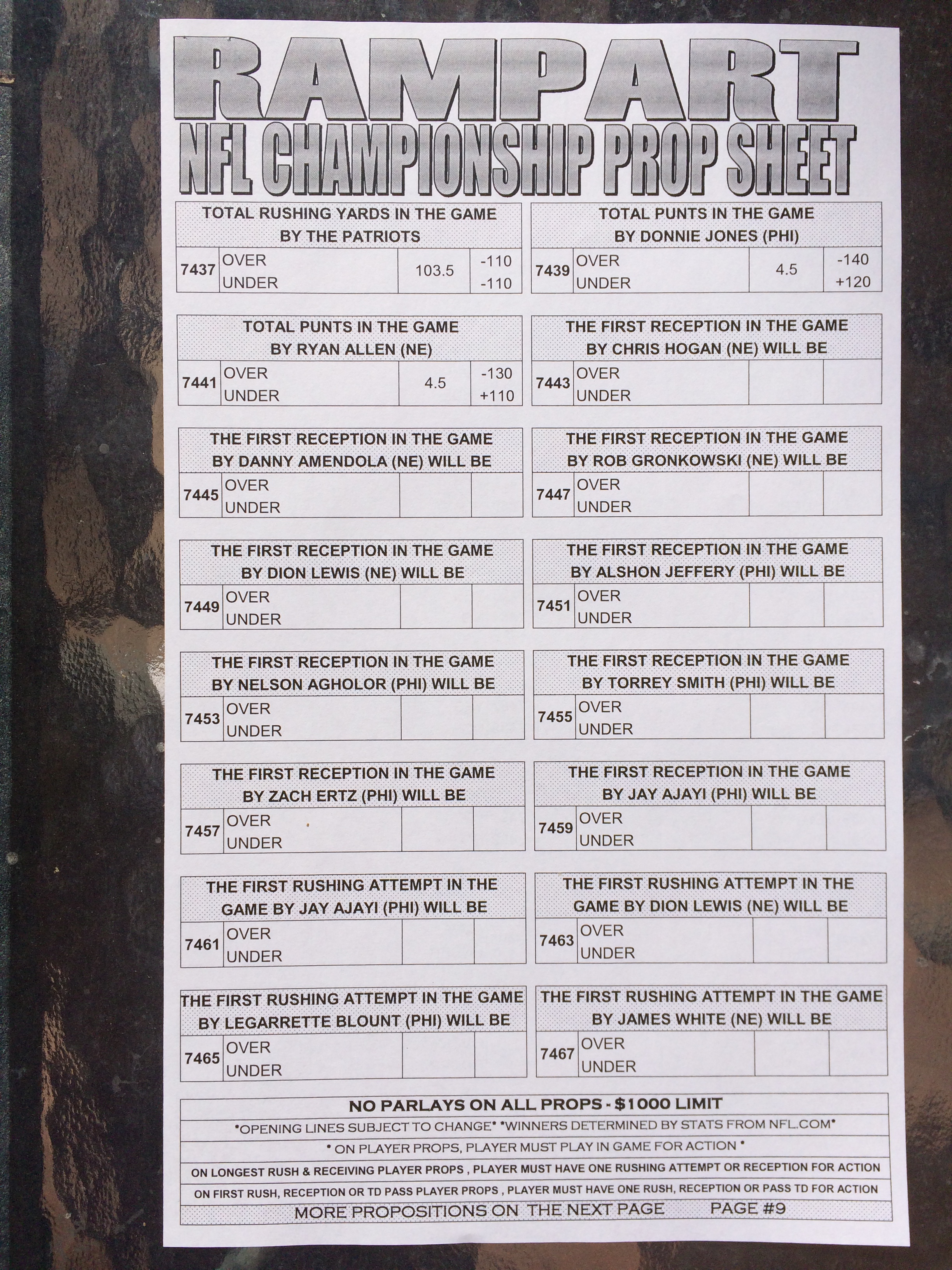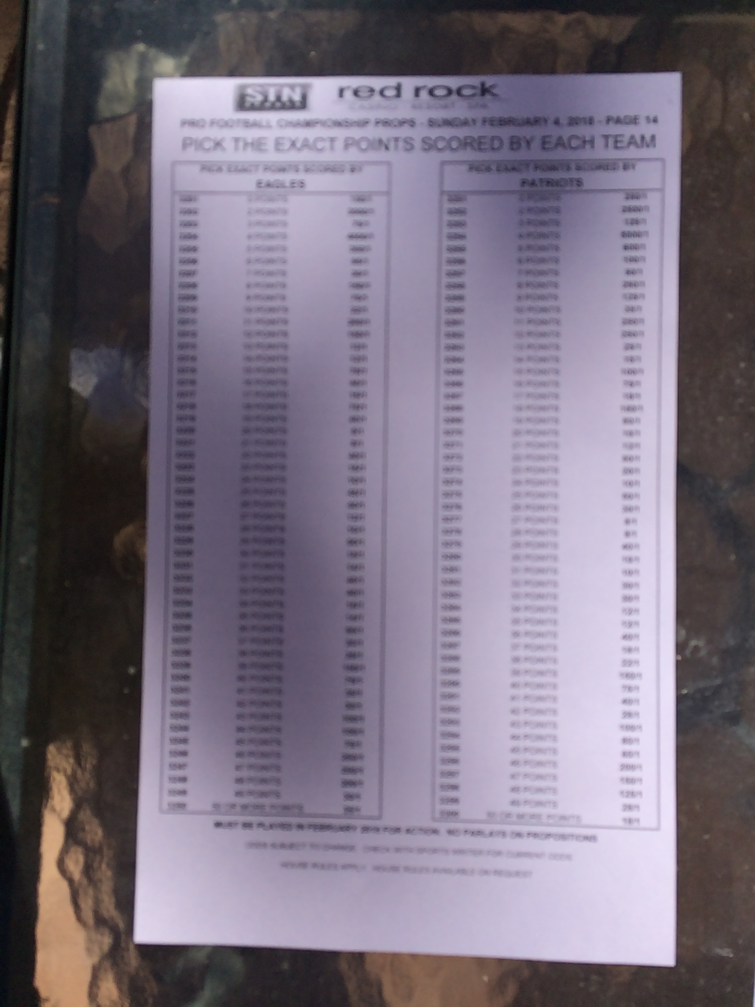 فيما يلي صور لكل صفحة من صفحات رهانات الاقتراحات لدى عدة مكاتب مراهنات رياضية في لاس فيغاس. جُمعت هذه الأوراق في ٢٧ يناير ٢٠١٨، أي قبل ثمانية أيام من المباراة.
