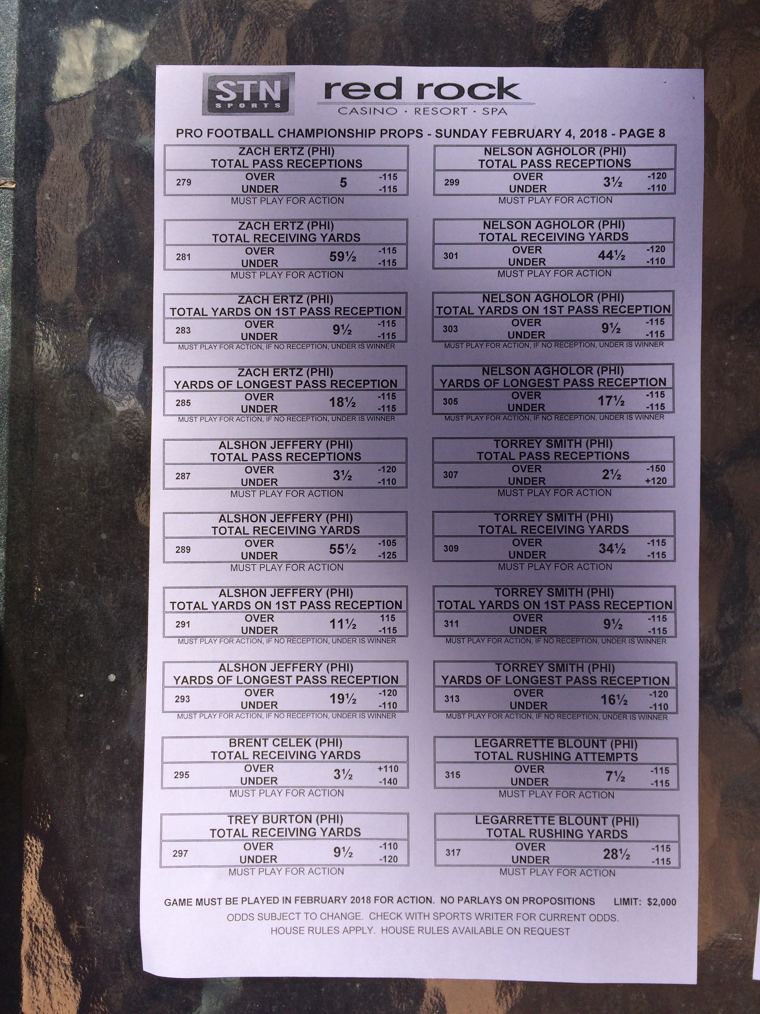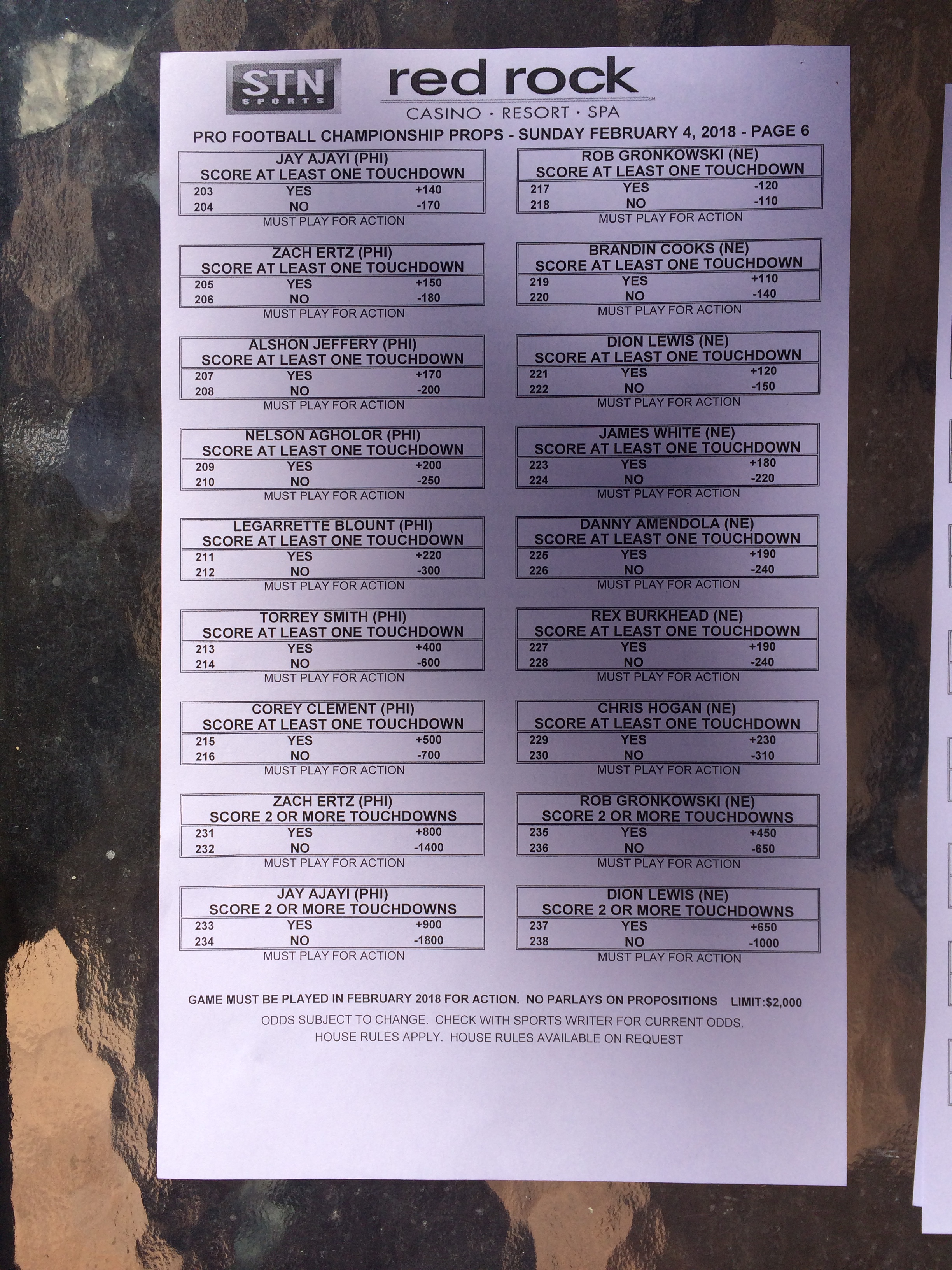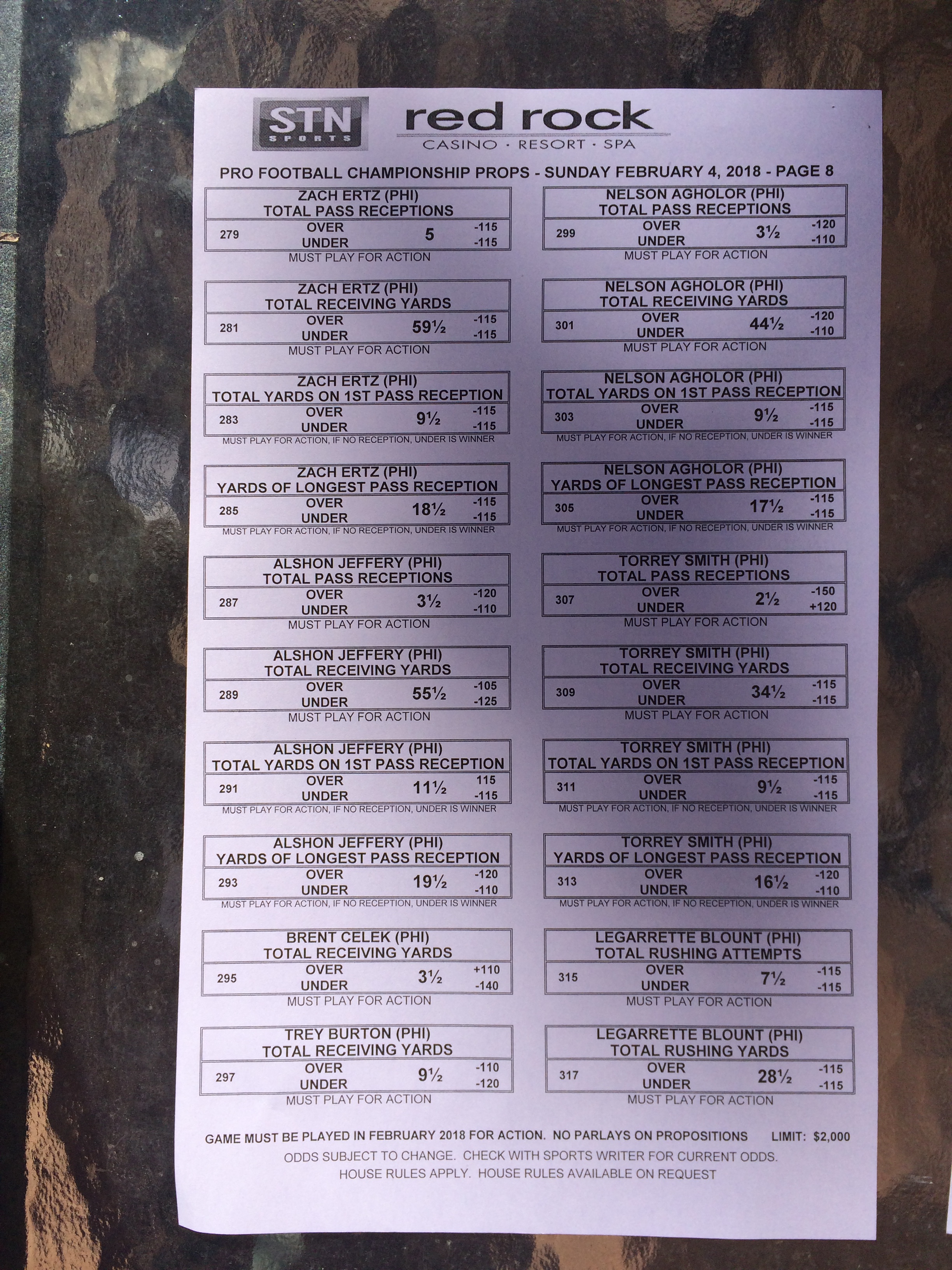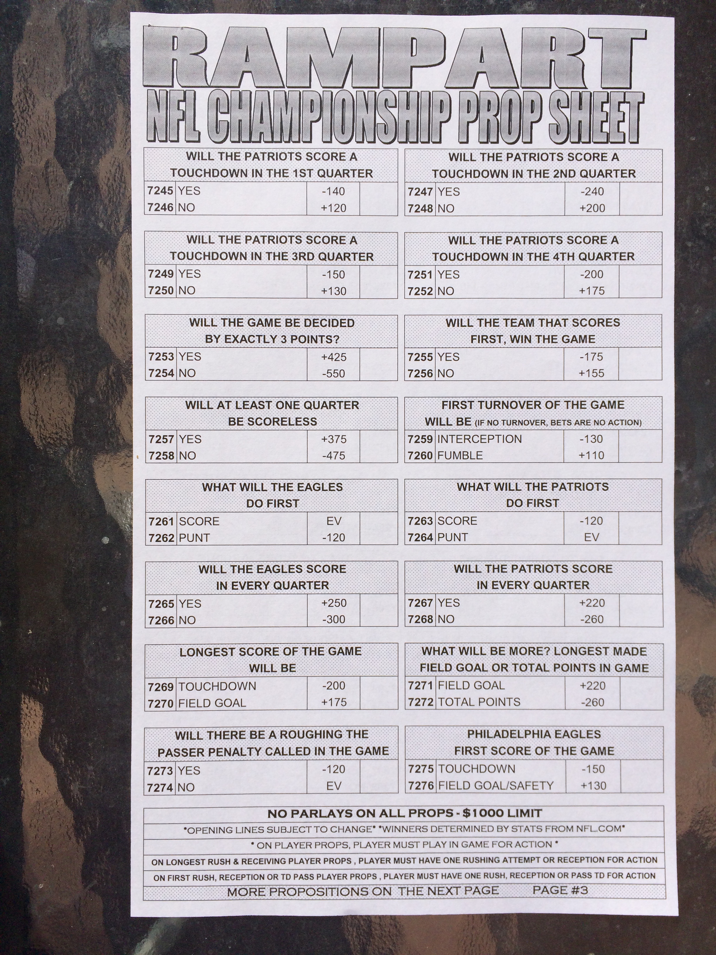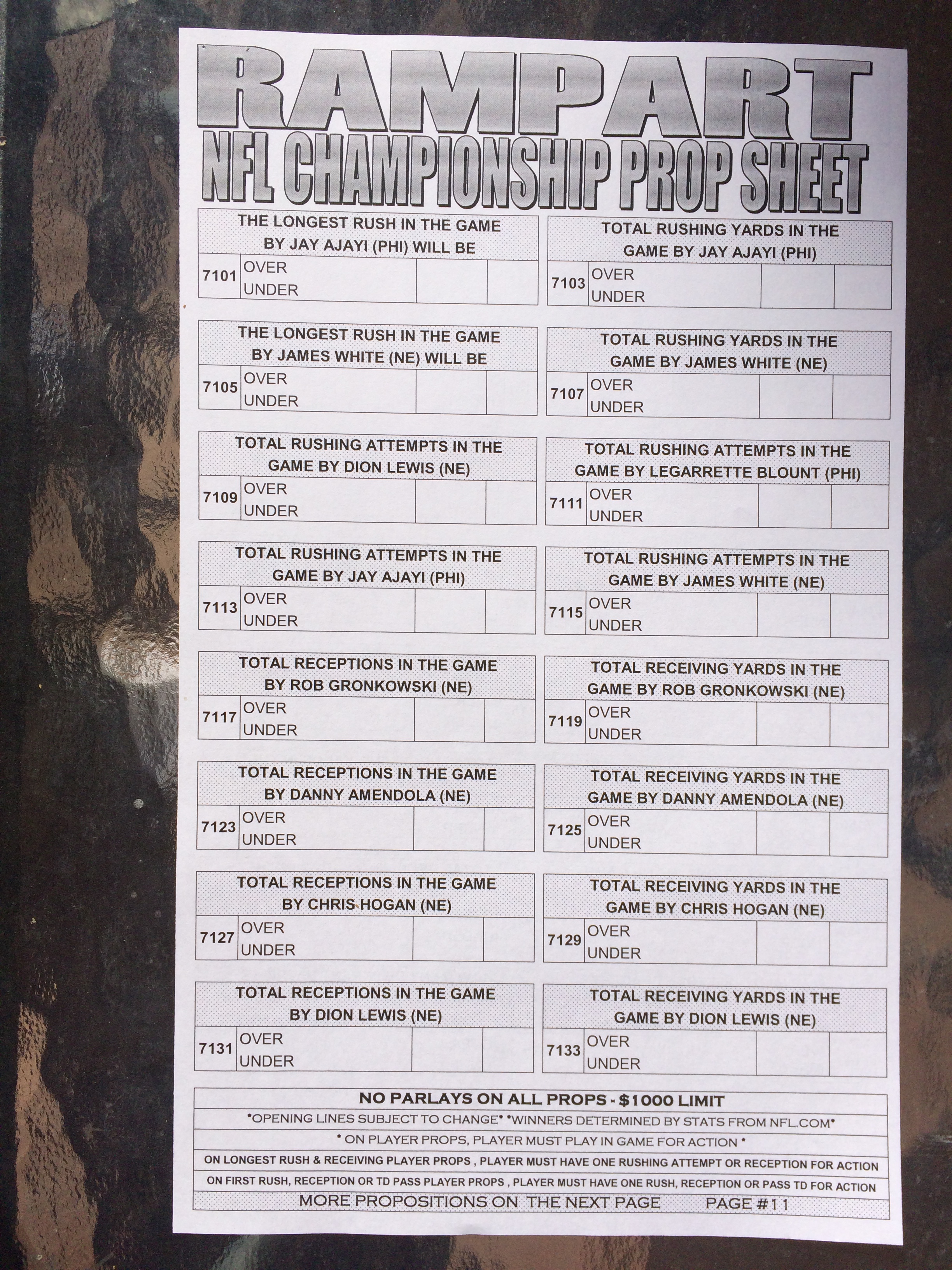 فيما يلي صور لكل صفحة من صفحات رهانات الاقتراحات لدى عدة مكاتب مراهنات رياضية في لاس فيغاس. جُمعت هذه الأوراق في ٢٧ يناير ٢٠١٨، أي قبل ثمانية أيام من المباراة.