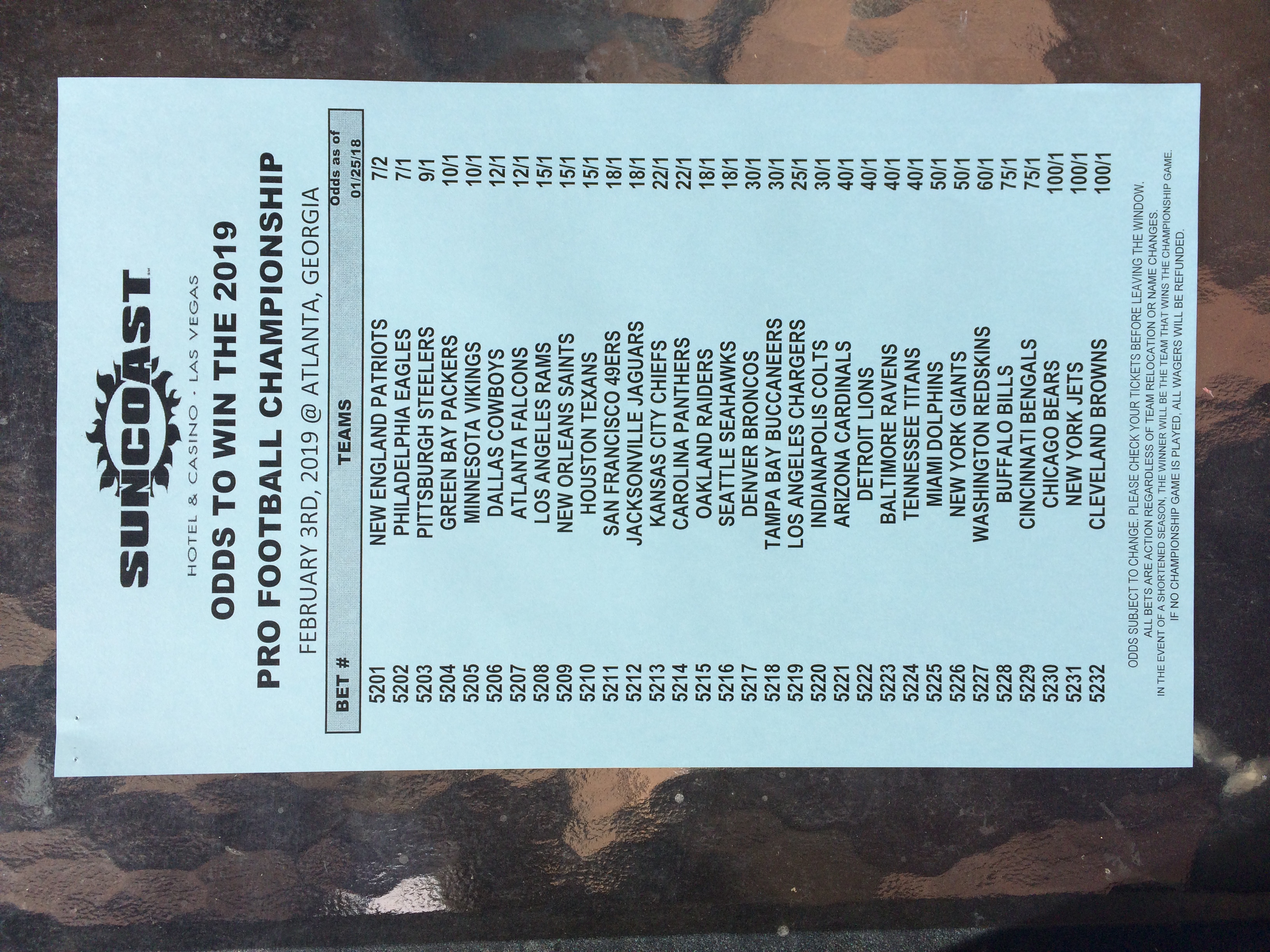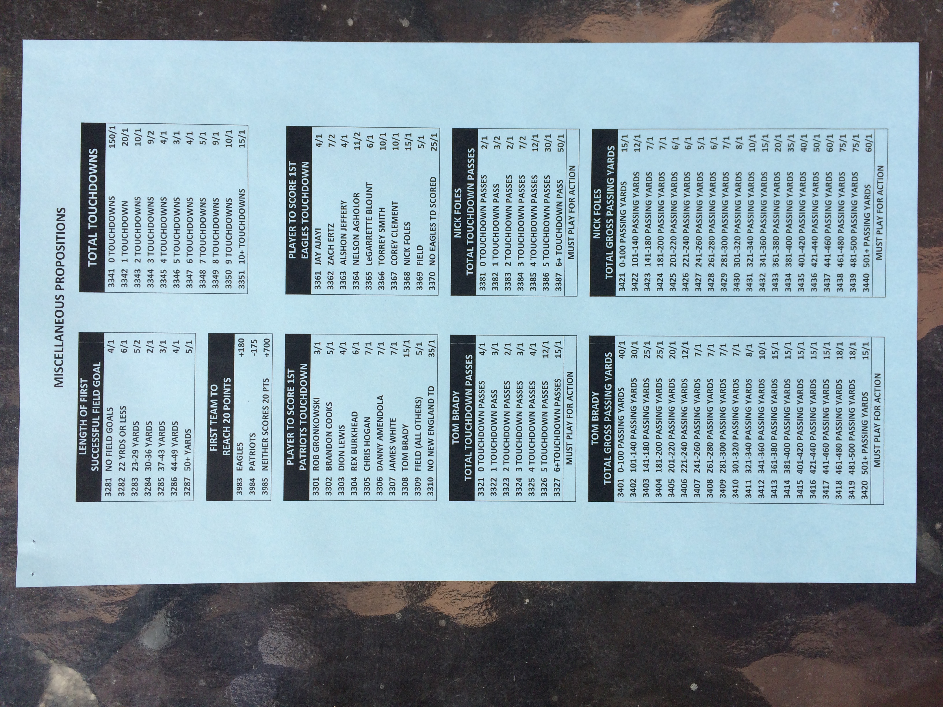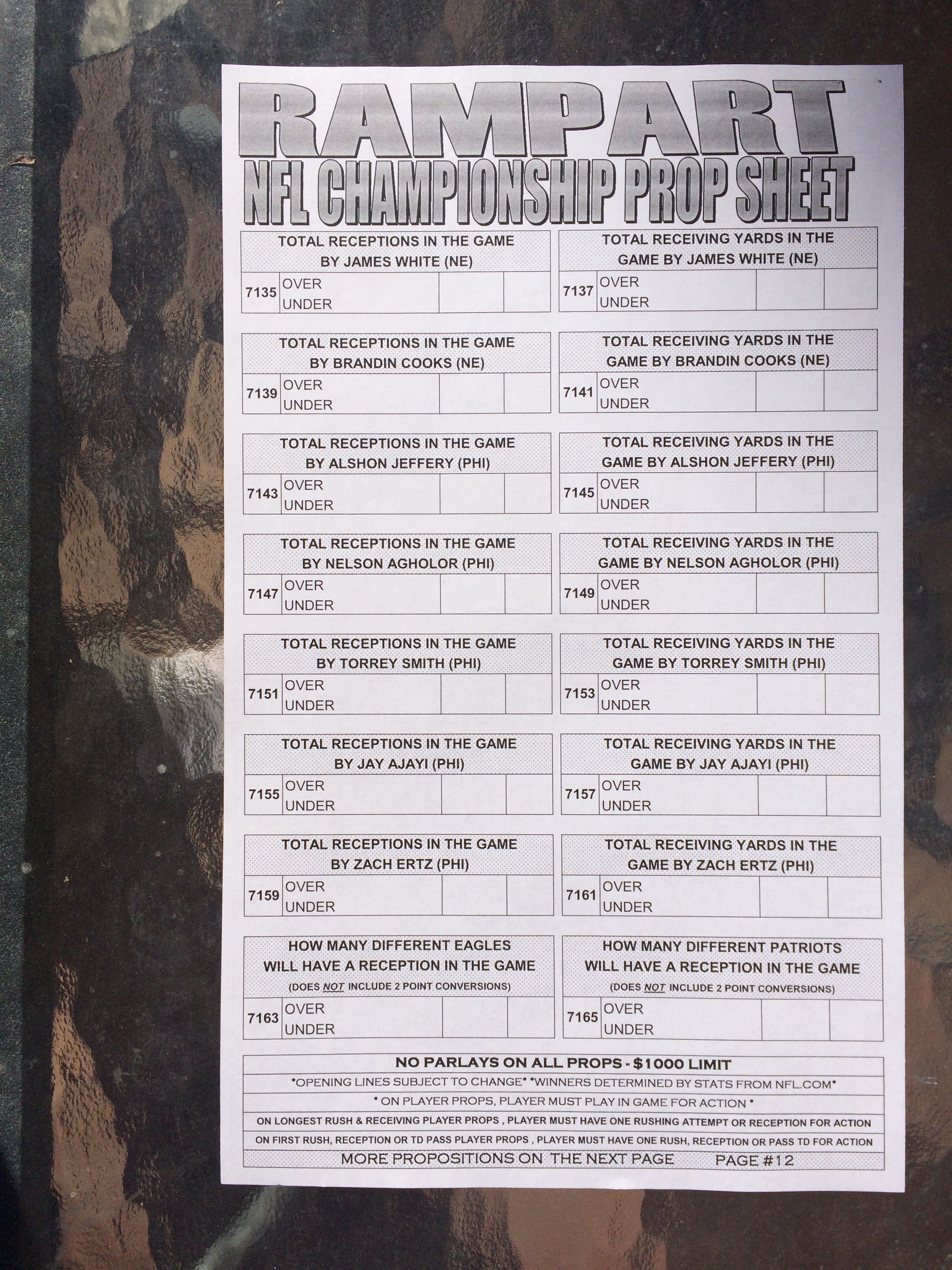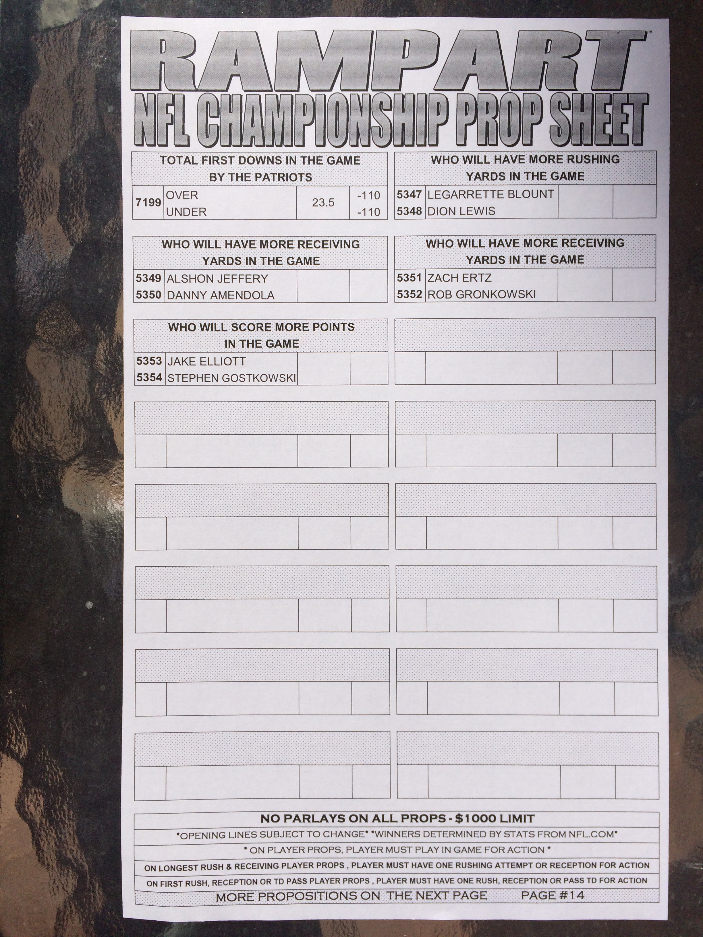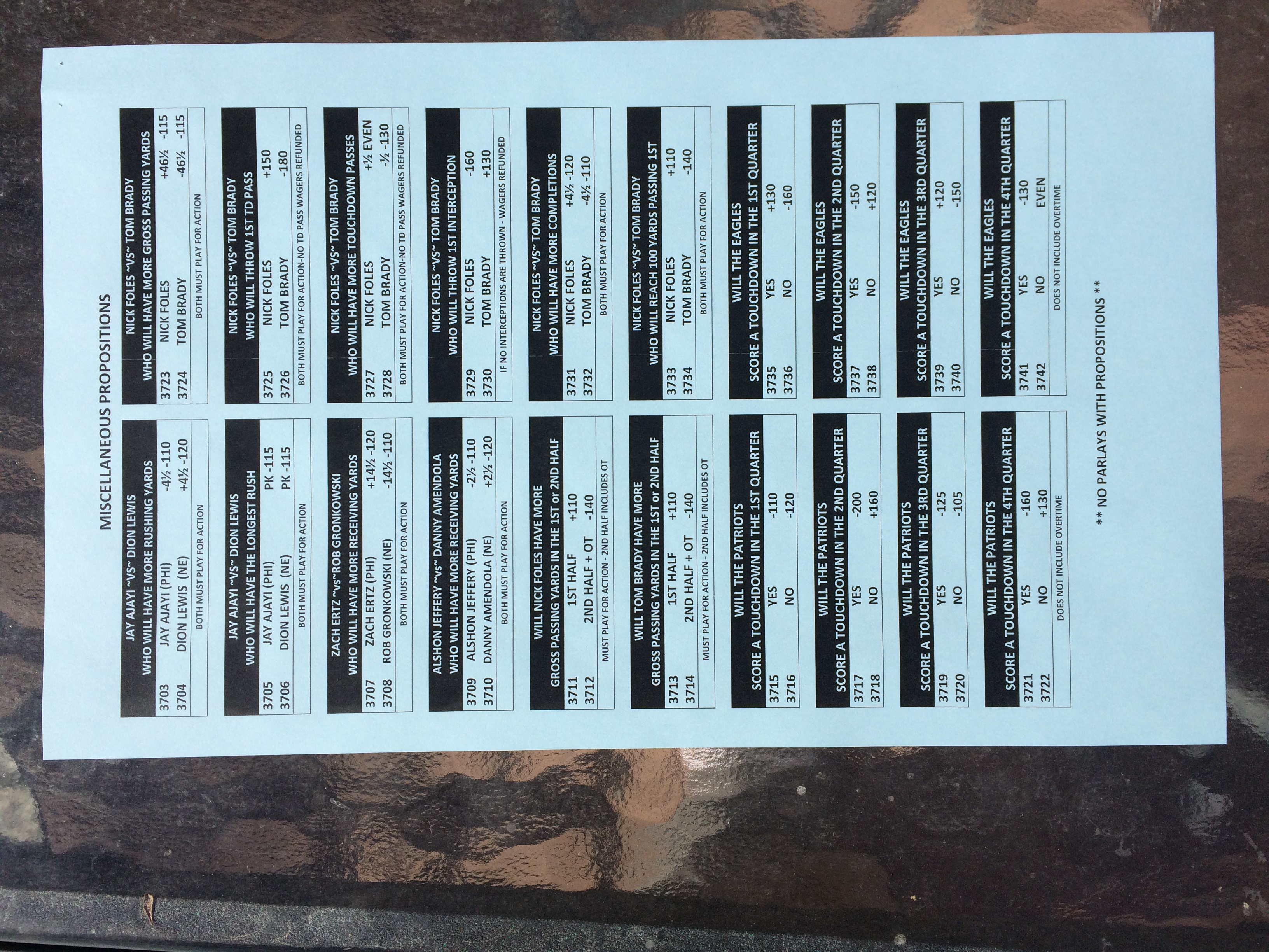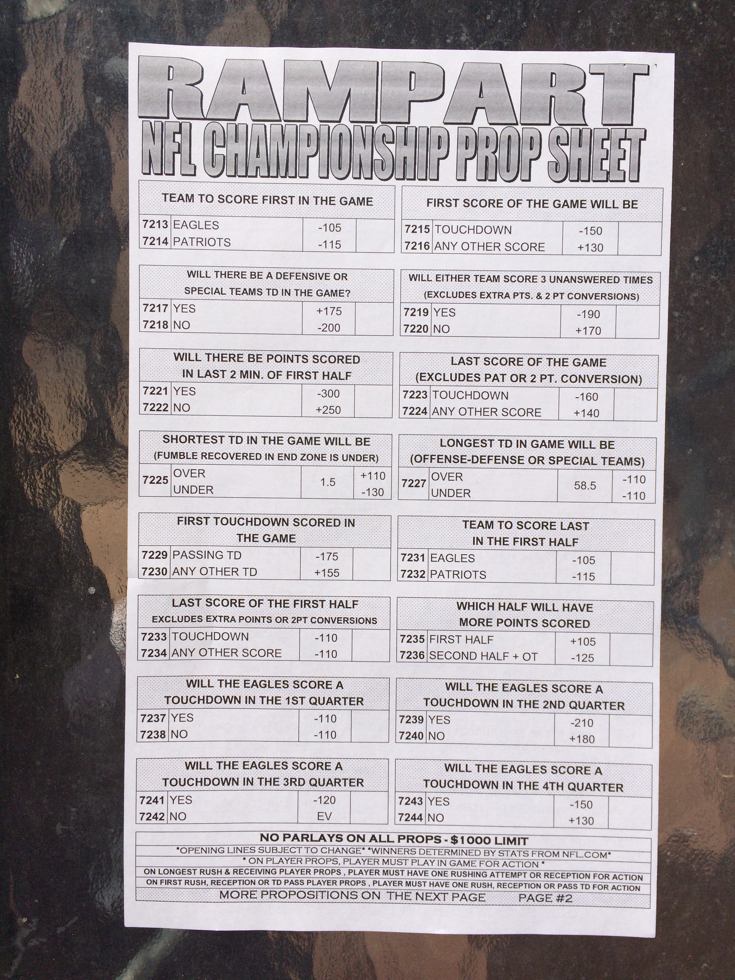 فيما يلي صور لكل صفحة من صفحات رهانات الاقتراحات لدى عدة مكاتب مراهنات رياضية في لاس فيغاس. جُمعت هذه الأوراق في ٢٧ يناير ٢٠١٨، أي قبل ثمانية أيام من المباراة.