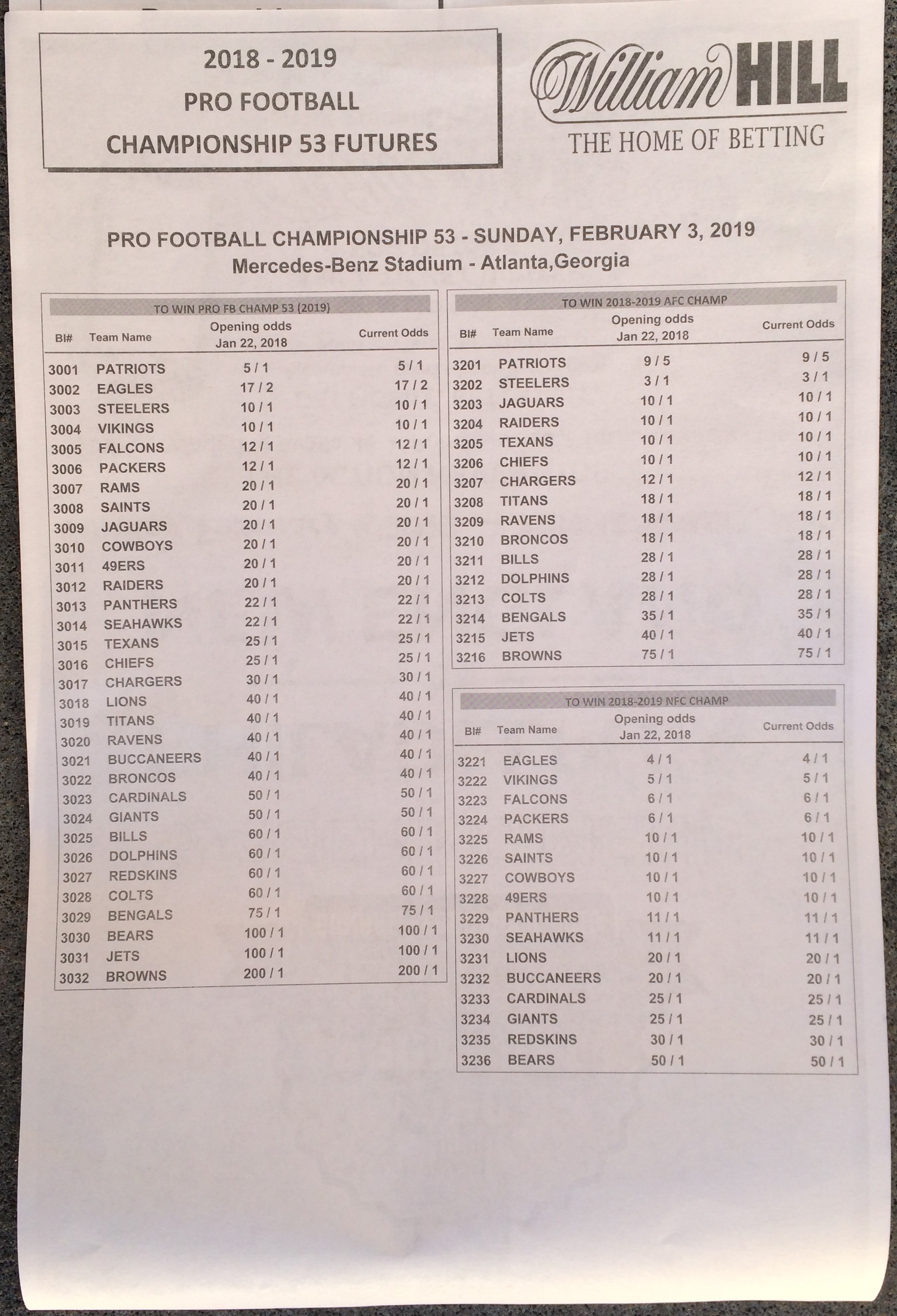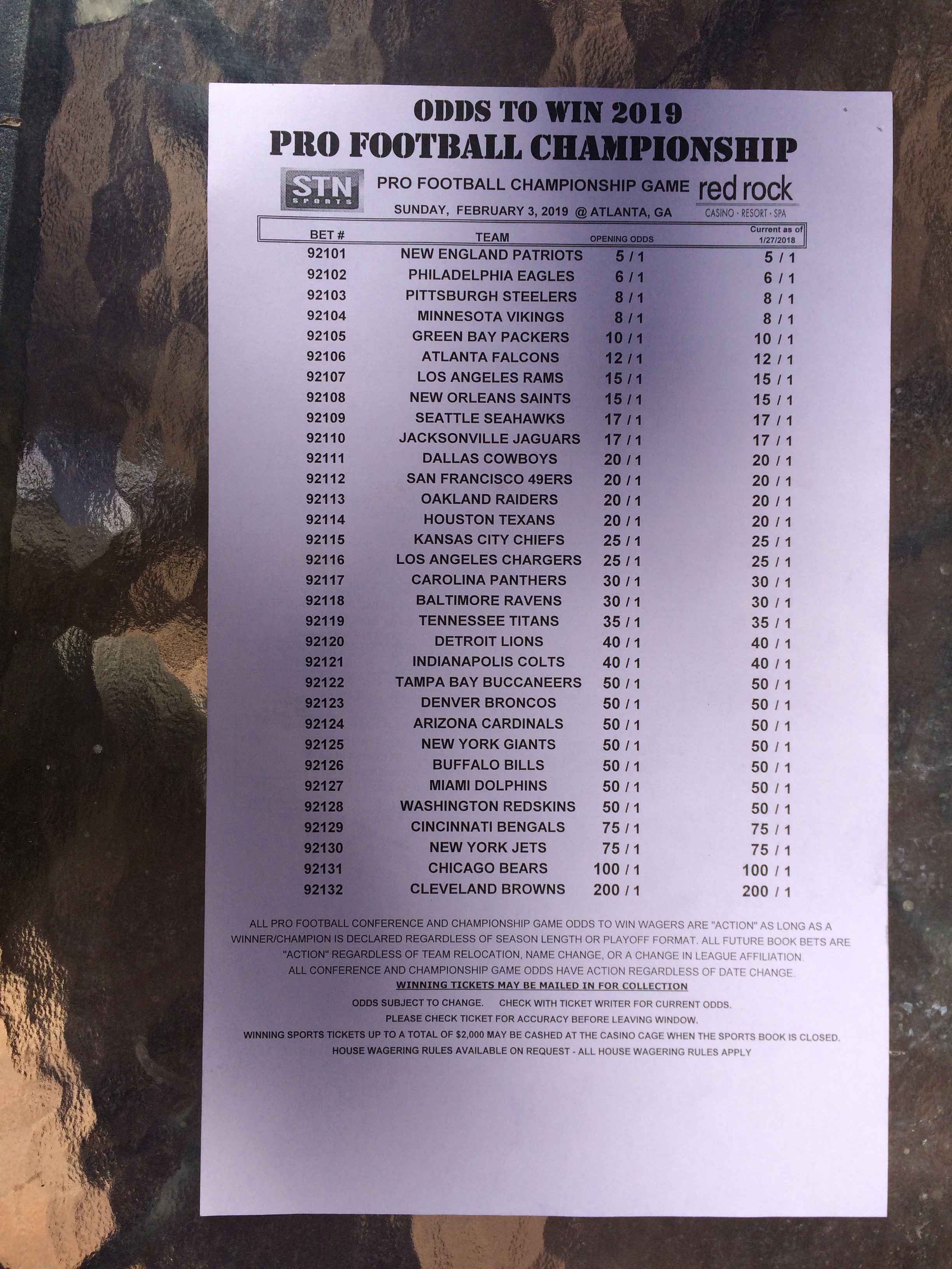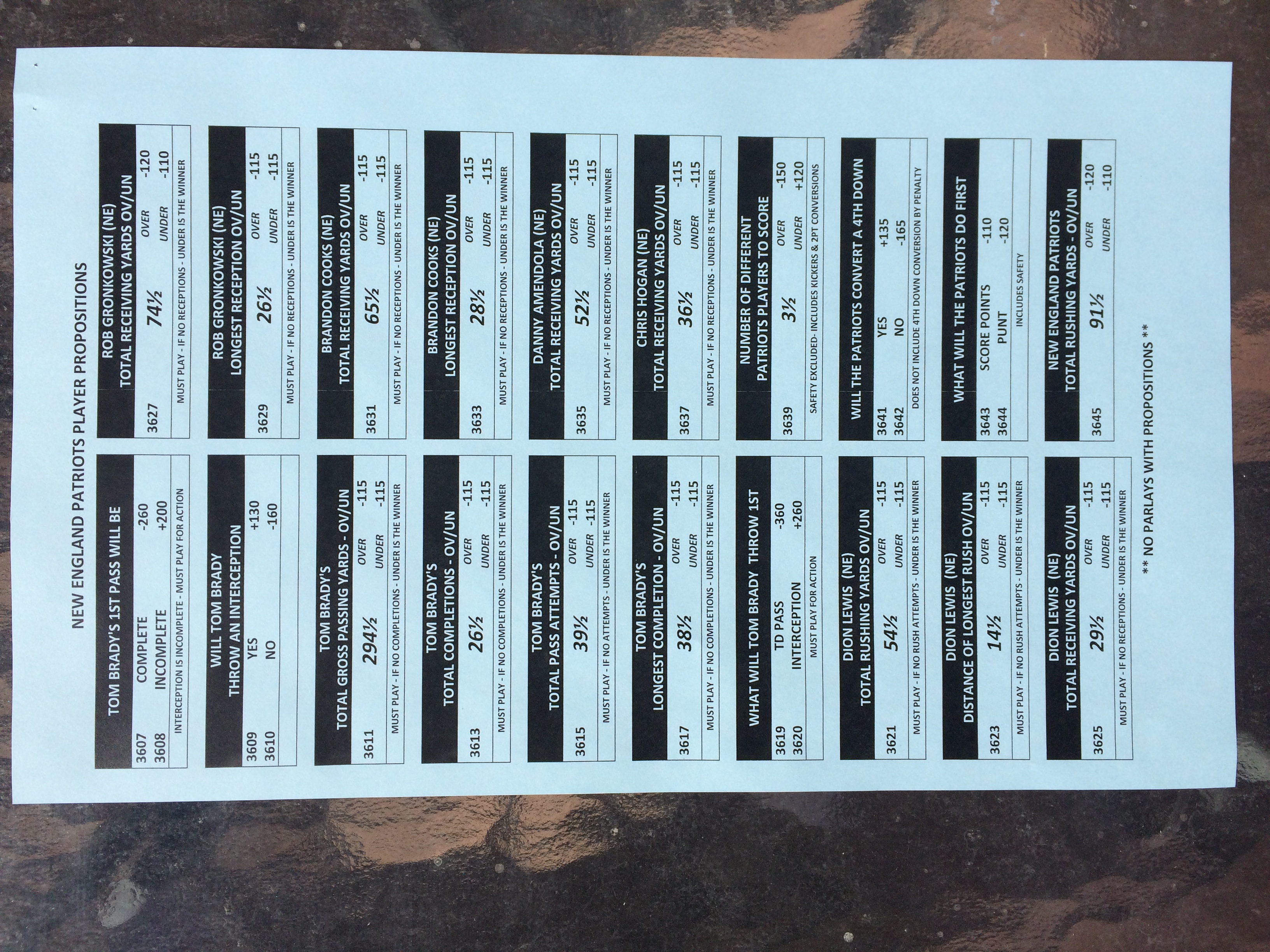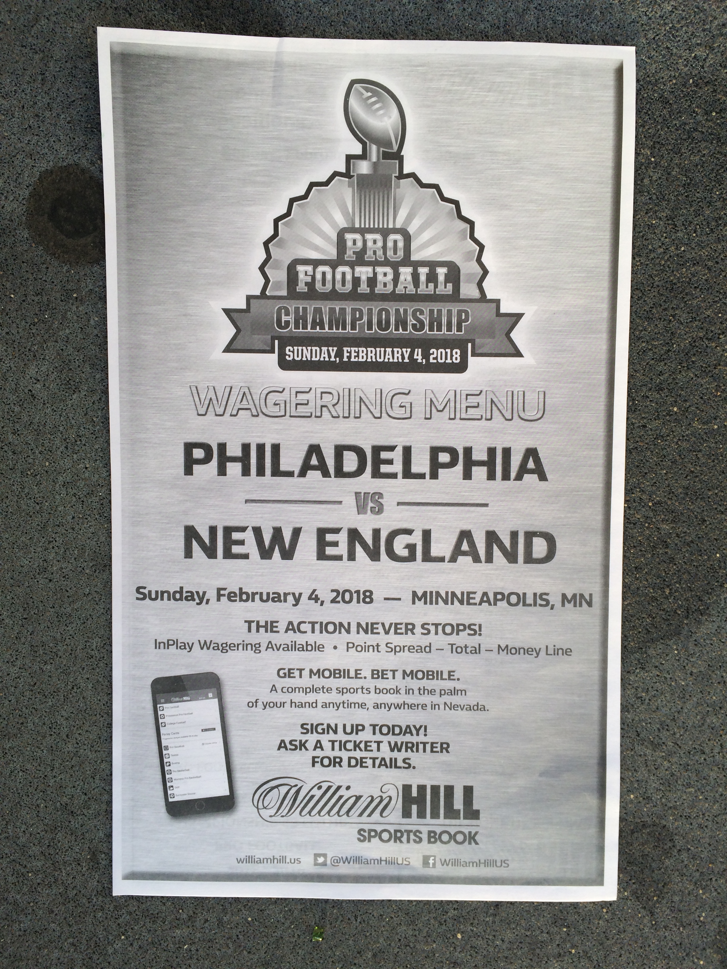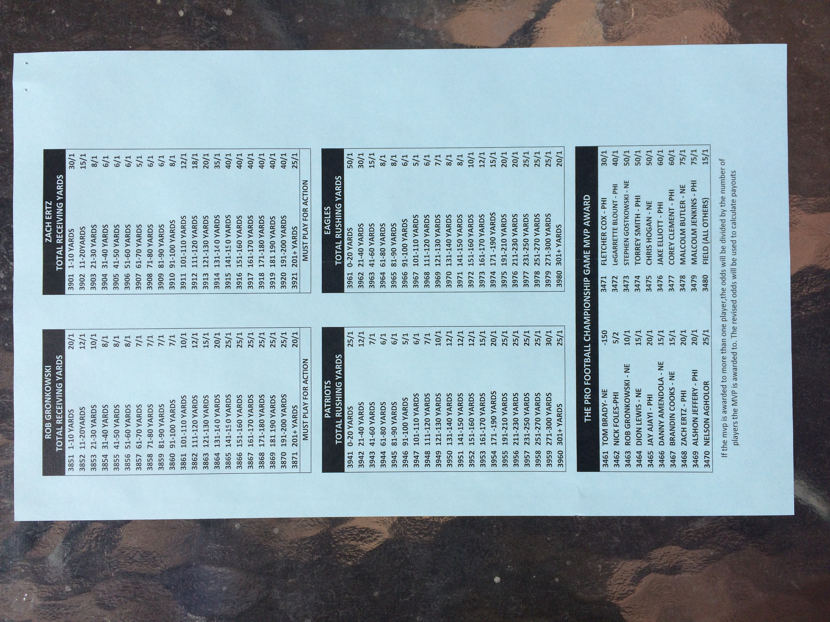 فيما يلي صور لكل صفحة من صفحات رهانات الاقتراحات لدى عدة مكاتب مراهنات رياضية في لاس فيغاس. جُمعت هذه الأوراق في ٢٧ يناير ٢٠١٨، أي قبل ثمانية أيام من المباراة.