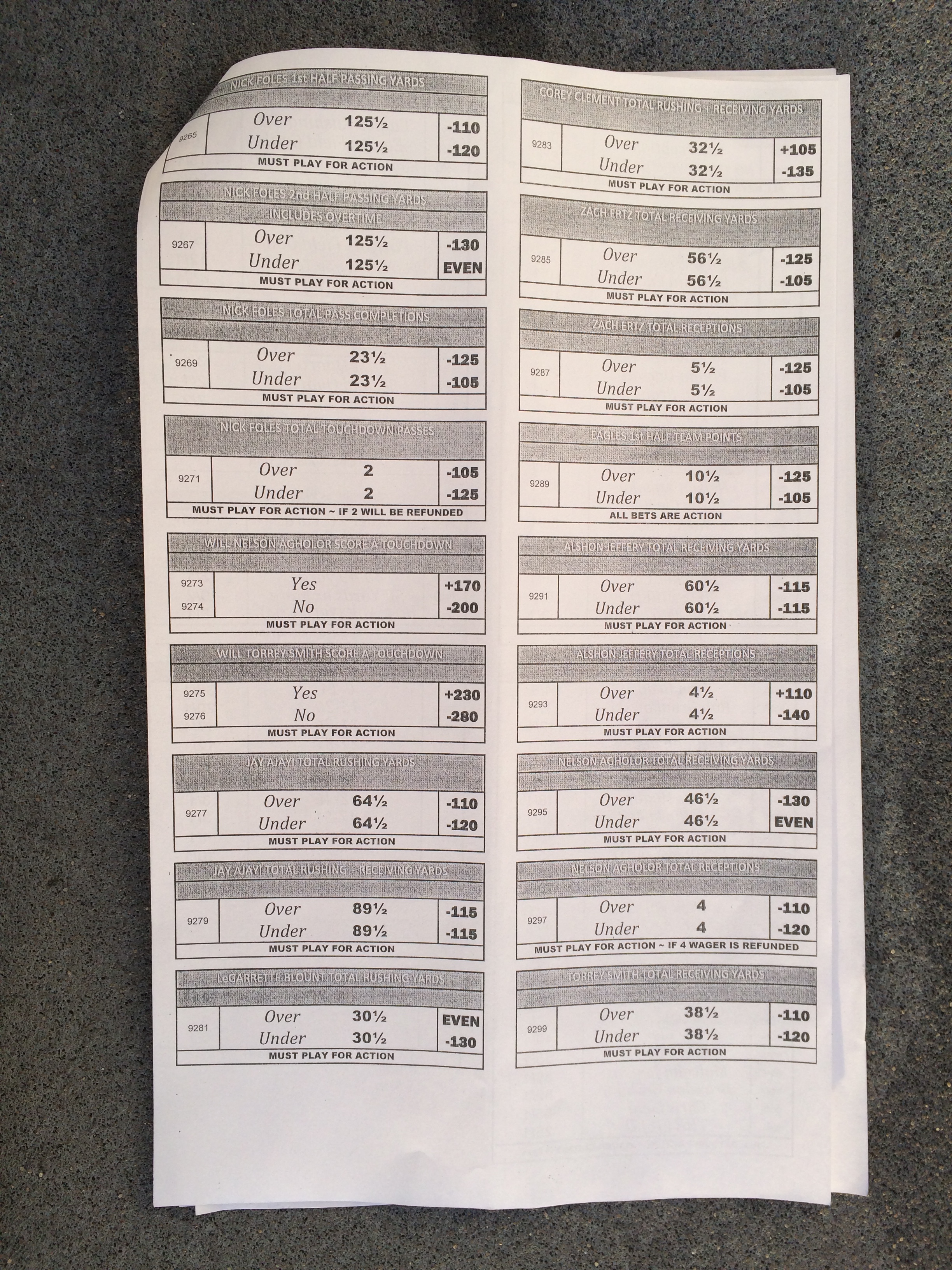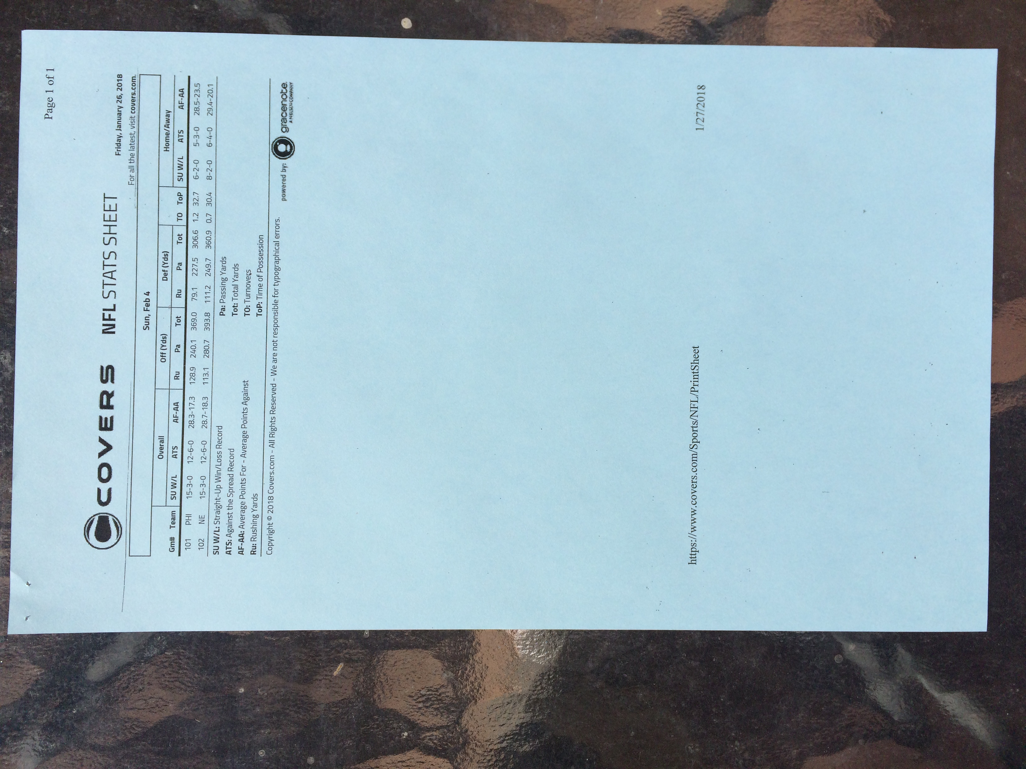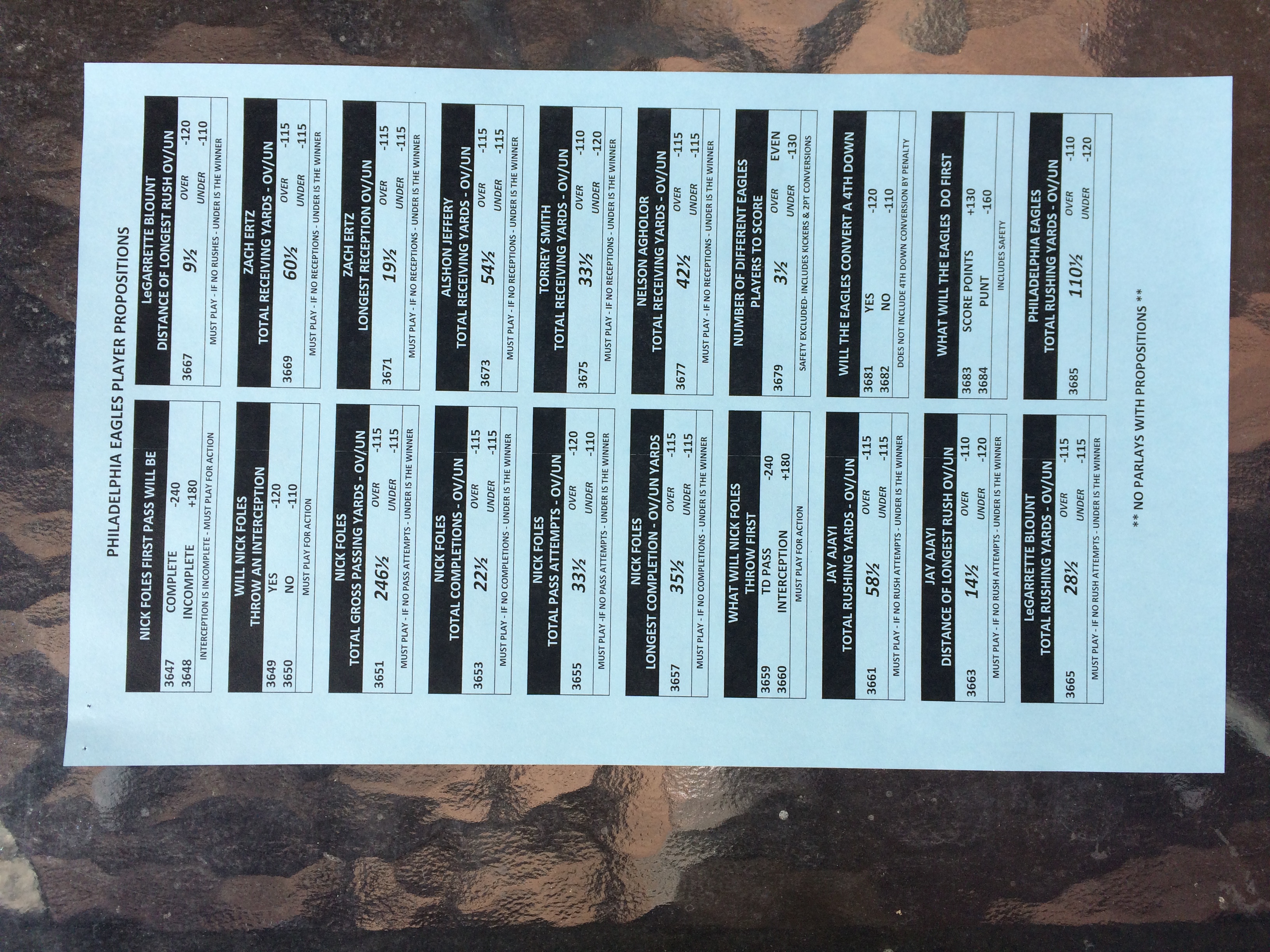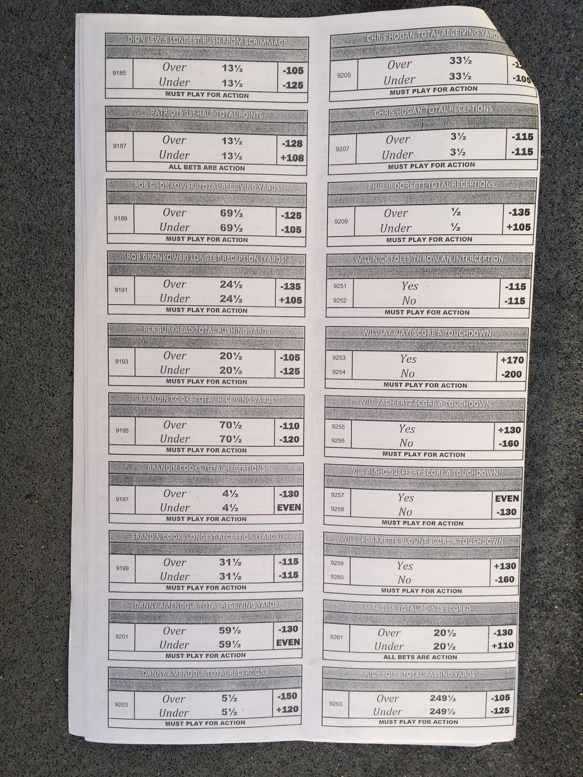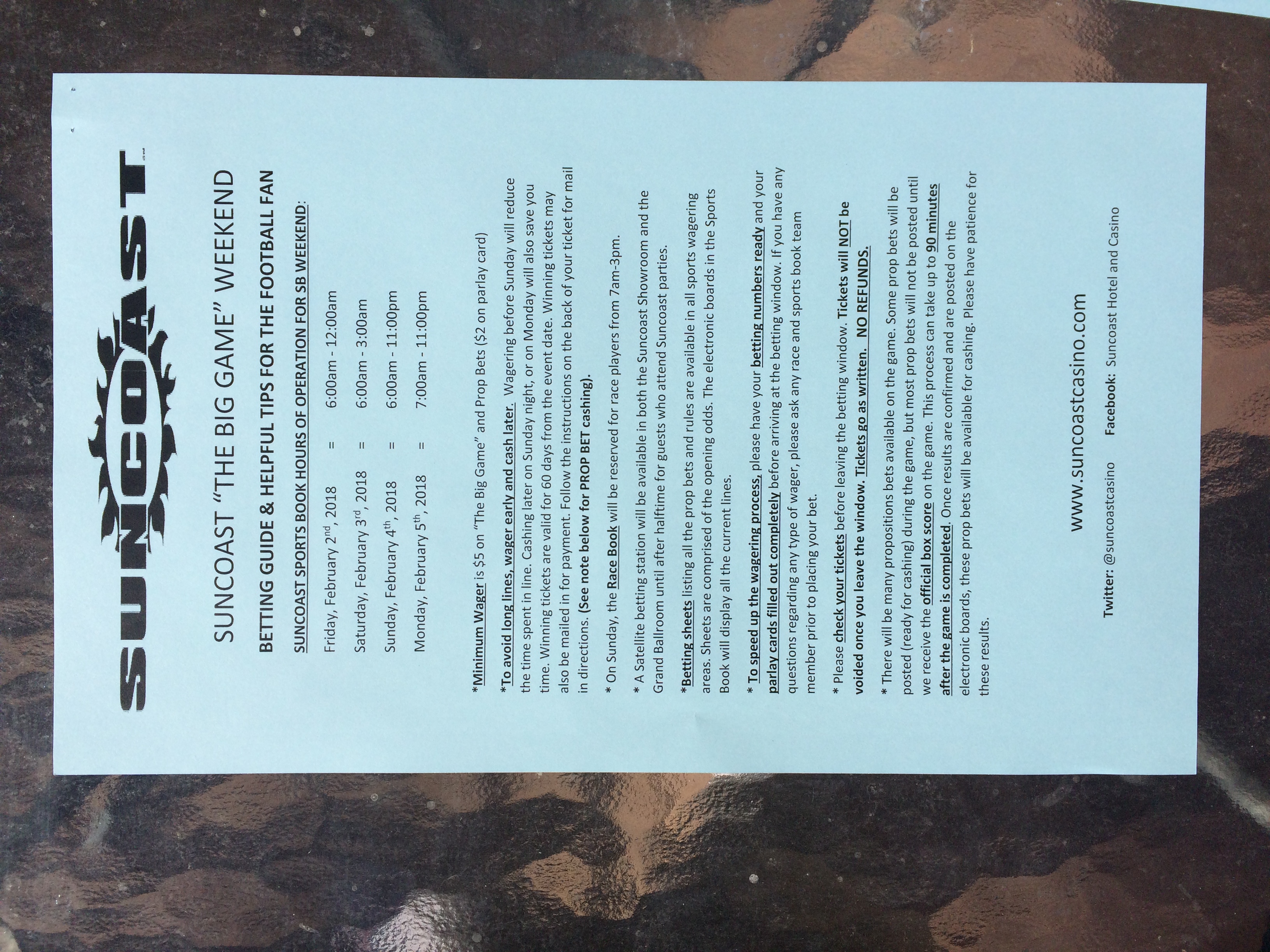 فيما يلي صور لكل صفحة من صفحات رهانات الاقتراحات لدى عدة مكاتب مراهنات رياضية في لاس فيغاس. جُمعت هذه الأوراق في ٢٧ يناير ٢٠١٨، أي قبل ثمانية أيام من المباراة.