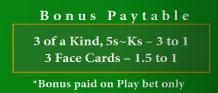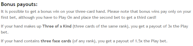 نصيحتي هي الانسحاب من اللعب بزوج من أربع أوراق أو أقل، حتى لو كانت مكافأة "ثلاثة من نفس النوع" تُدفع على أي ثلاثة من نفس النوع. بمعنى آخر، لا يهم تناقض القواعد حول ما إذا كانت المكافأة تُدفع على ثلاثة آسات إلى أربعة أوراق، إذ يجب على اللاعب الانسحاب على أمل الحصول على هذه الأوراق الثلاثة المنخفضة من نفس النوع على أي حال.