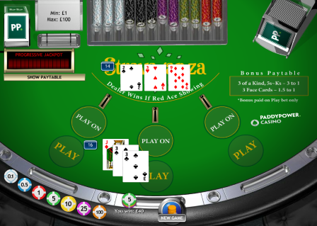 - إذا كانت البطاقة الثانية أو الثالثة لدى الموزع عبارة عن آس أحمر، فسوف يخسر اللاعب كل من رهان اللعب ورهان اللعب الإضافي، إذا تم وضعه.