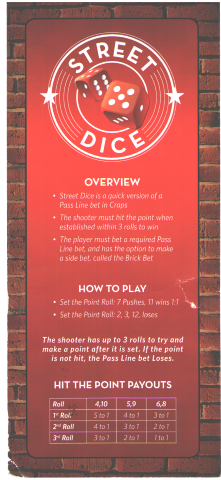 هناك رهانان فقط في لعبة Street Dice. يُلعب كلاهما بنردين عاديين.