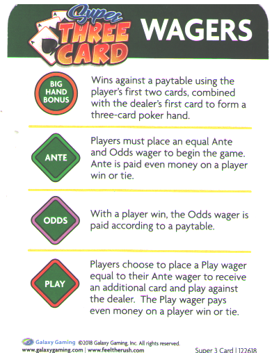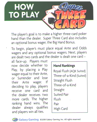 تشبه لعبة Super Three Card هيكل الرهان في Ultimate Texas Hold 'Em ، ولكنها تعتمد على ثلاث بطاقات كما في لعبة Three Card Poker . ولكن انتظر، هناك المزيد، تُلعب اللعبة بمجموعات أوراق مكونة من ست أو ثماني مجموعات. كل الفضل يعود لشركة Galaxy Gaming لتجربة شيء جديد. لاحظتُ هذه اللعبة لأول مرة في كازينو Rampart في لاس فيغاس في 28 يناير 2019.