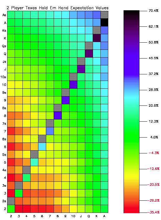 يوضح الجدول التالي عدد مرات فوز وخسارة وتعادل كل يد أولية في لعبة ثنائية اللاعبين. القيمة المتوقعة هي احتمال الفوز مطروحًا منه احتمال الخسارة. الاحتمال هو احتمال الحصول على تلك اليد تحديدًا، والاحتمال الإضافي هو احتمال الحصول على تلك اليد تحديدًا أو أي يد أعلى منها في القائمة.