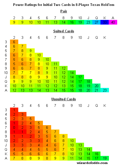 يوضح الجدول التالي تقييمي لقوة كل يد أولية من ورقتين في لعبة لثمانية لاعبين. الأرقام على مقياس من 0 إلى 40. باختصار، يجب أن تلعب فقط بأيدٍ خضراء داكنة أو زرقاء أو أرجوانية. بالطبع، يجب أن تكون أكثر سخاءً في الوضع الأخير، وانتقائية في الوضع المبكر.