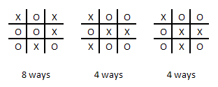 إذا كان هناك 4 نقاط X و5 نقاط O، فإن هناك مجموعًا (9، 4) = 126 طريقة لوضع نقاط X وO على اللوحة. من بين هذه الـ 126 طريقة، 16 طريقة تؤدي إلى التعادل. توضح الصورة أدناه أنماط التعادل الثلاثة، وعدد طرق تدوير أو انعكاس كل منها. لذا، فإن احتمال التعادل، مع وجود 4 أو 5 نقاط X، هو 16/126 = 12.70%.
