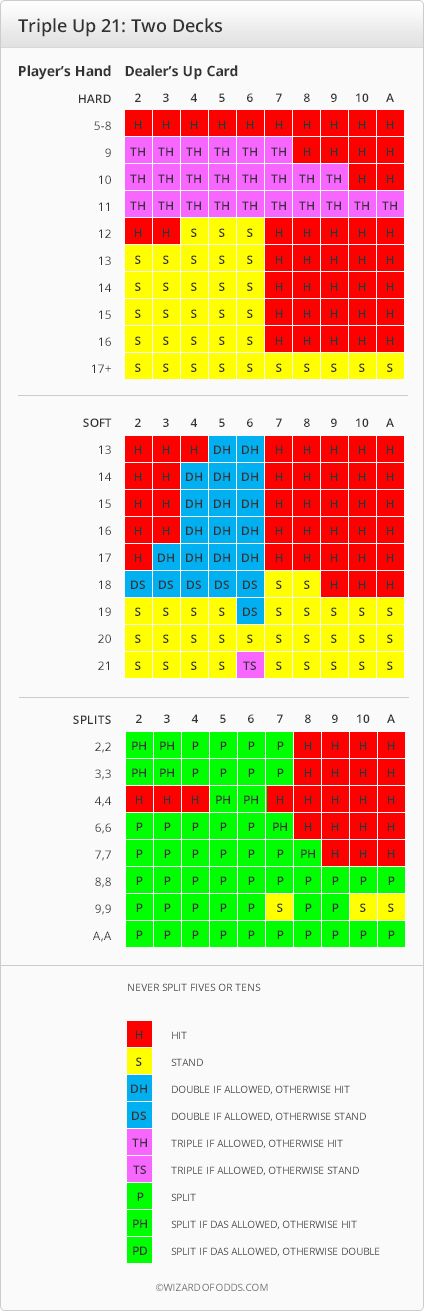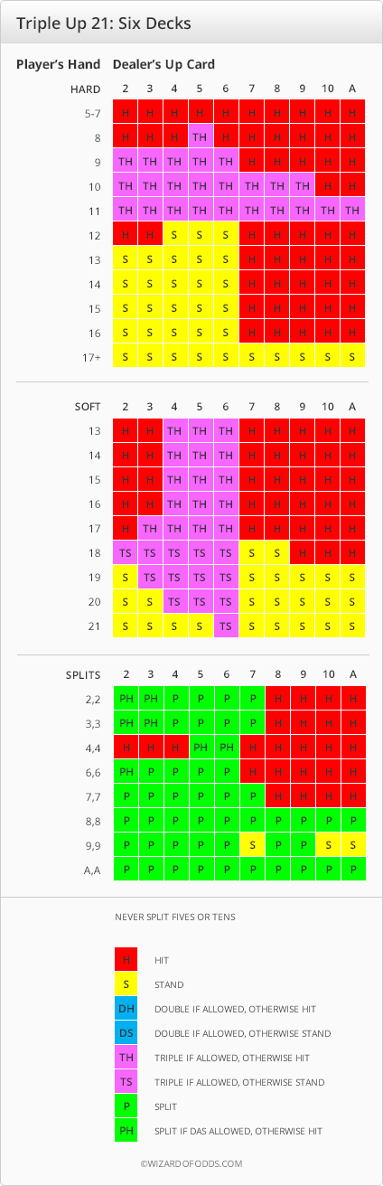 على عكس ما قد تقوله بطاقات القواعد، فيما يلي قواعد لعبة Triple Up 21. في أي لعبة، اسأل الموزع عن القواعد إذا لم تكن متأكدًا.- يجوز للاعب مضاعفة رهانه ثلاث مرات في بعض الجولات الأولية المكونة من ورقتين. مع ست مجموعات أوراق، يجوز للاعب مضاعفة رهانه ثلاث مرات في أي جولة أولية مكونة من ورقتين. مع مجموعتين من الأوراق، يقتصر المضاعفة على مجموع صعب يتراوح بين 9 و11. مع مجموعة أوراق واحدة، يقتصر المضاعفة على مجموع صعب يتراوح بين 10 و11. قد يُسمح أيضًا بالمضاعفة ثلاث مرات في لعبة بلاك جاك مع مجموعة أوراق واحدة أو مجموعتين، حسب الكازينو.