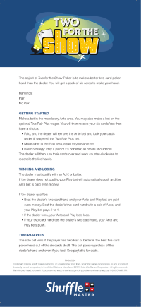 رأيتُ لعبة "اثنان للعرض" لأول مرة في كازينو إكسكاليبر بلاس فيغاس في ١١ أغسطس ٢٠١٦. بناءً على اسمها، قد يظن المرء أنها جزء ثانٍ للعبة "واحد للمال" . مع ذلك، لا أرى أي تشابه بينها وبين تلك اللعبة. بل إنها تتبع بنية لعبة "بوكر الثلاث ورقات" عن كثب.