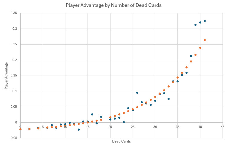 تُظهر النقاط الزرقاء في الرسم البياني نتائج المحاكاة الفعلية. وتُظهر النقاط البرتقالية نقاطًا على خط انحدار أُسي. صيغة ميزة اللاعب (بناءً على رهان "أنتي")، بناءً على عدد البطاقات الميتة، هي كما يلي: