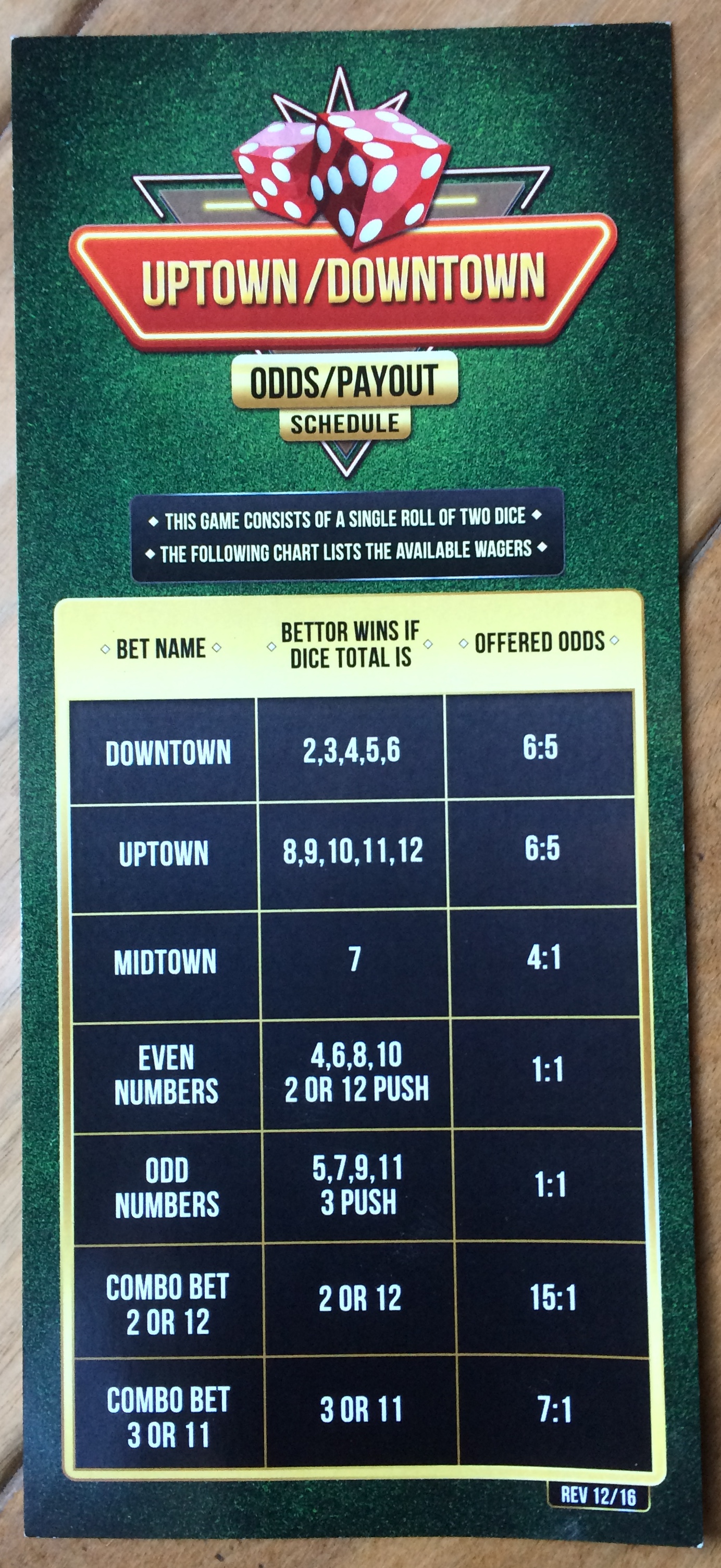 رأيت لعبة Uptown/Downtown لأول مرة في Silver Legacy في رينو في 19 يناير 2017. إنها لعبة نرد بسيطة حيث يتم حل كل رهان في رمية واحدة.