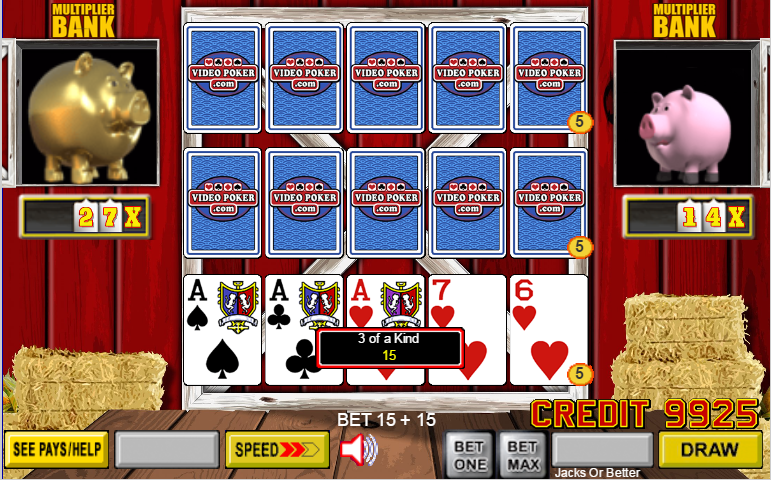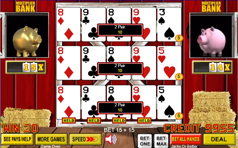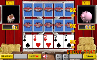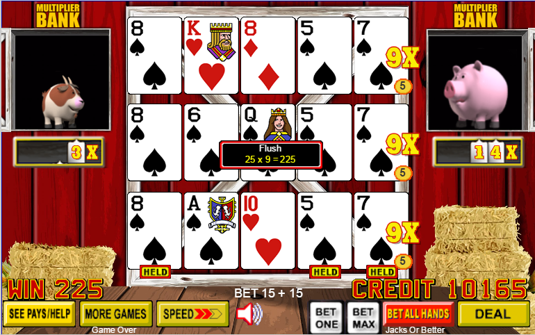تحسنت اليد الوسطى إلى فلوش، والذي، في لعبة "جاك أور بيتر" التي كنت ألعبها، يدفع 5 لكل رهان رصيد. برهان أساسي قدره 5 رصيد لكل يد ومضاعف 9x، كان إجمالي الربح 5×5×9 = 225 رصيدًا.