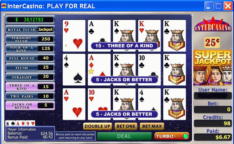 الألعاب المتاحة حاليًا هي: All American، وDeuces Wild، وDouble Bonus، وJacks or Better، وJoker Poker، وTens or Better، وSuper Jackpot، وهي لعبة Jacks or Better تصاعدية. يمكن للاعب اللعب على 3 أو 5 أو 10 خطوط.