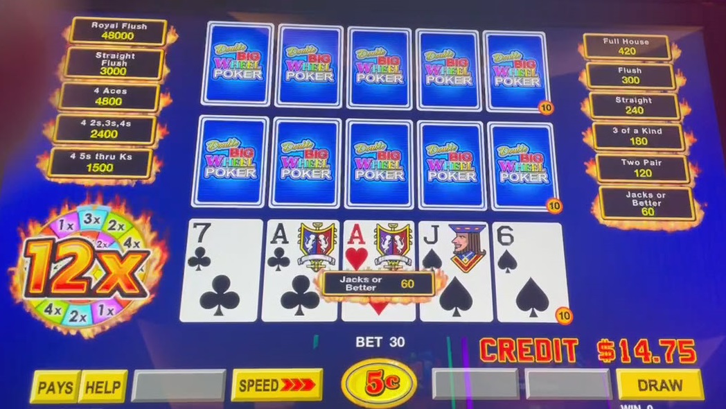 - Double Big Wheel Poker هي ميزة اختيارية تعتمد على لعبة فيديو بوكر 3 و5 و10 مرات لعب.