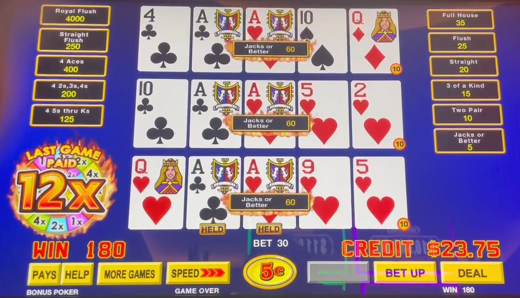 لم يتحسن أيٌّ من الأوراق. مع ثلاثة انتصارات بقيمة ٥ للزوج الأعلى ومضاعف ١٢x، كان إجمالي ربحي ٥×٣×١٢ = ١٨٠ رصيدًا.