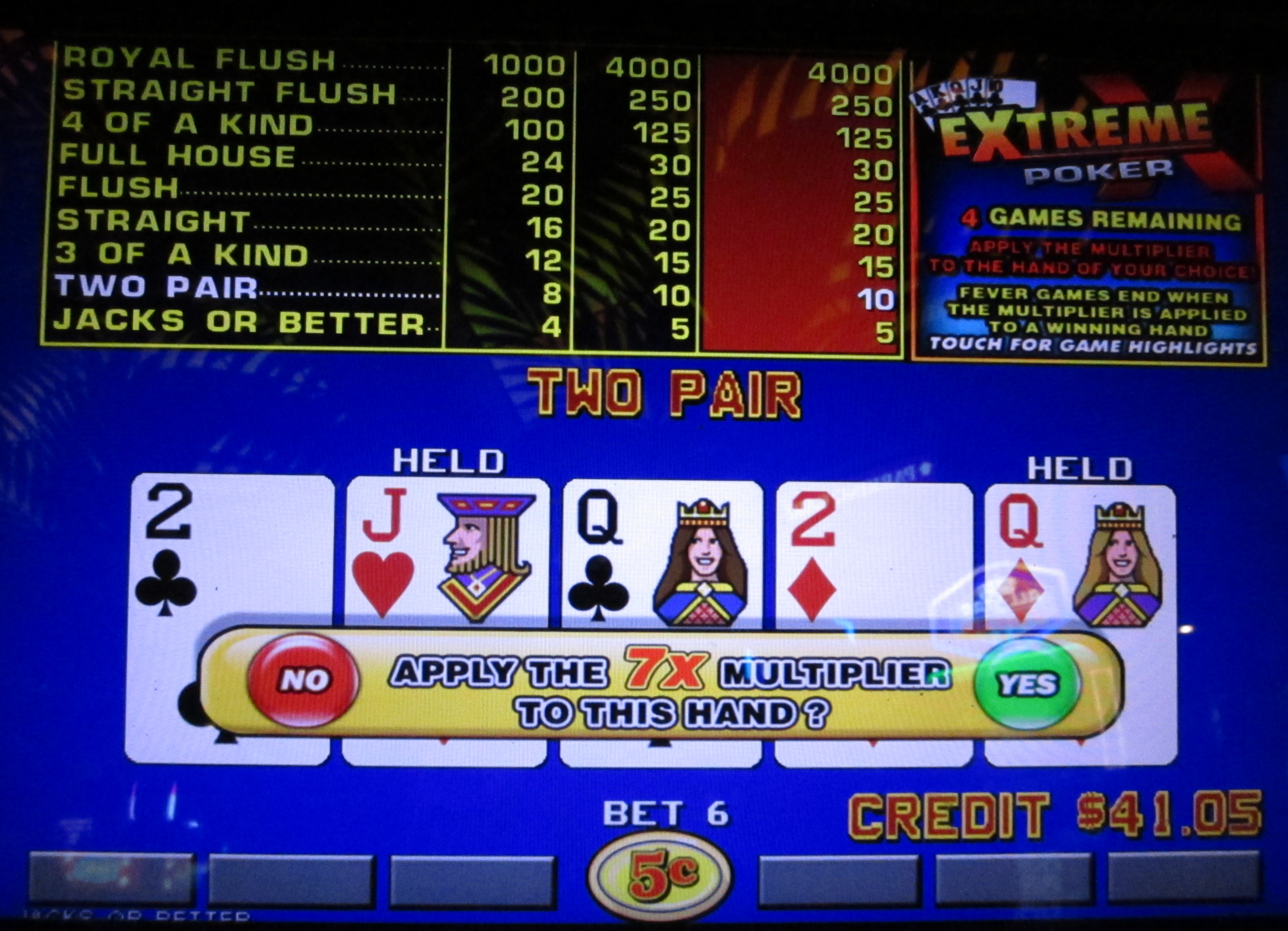 - تلعب لعبة Extreme X Poker مثل لعبة فيديو البوكر التقليدية ذات الخط الواحد للرهان من عملة واحدة إلى خمس عملات معدنية.