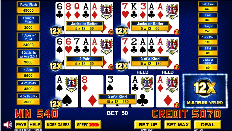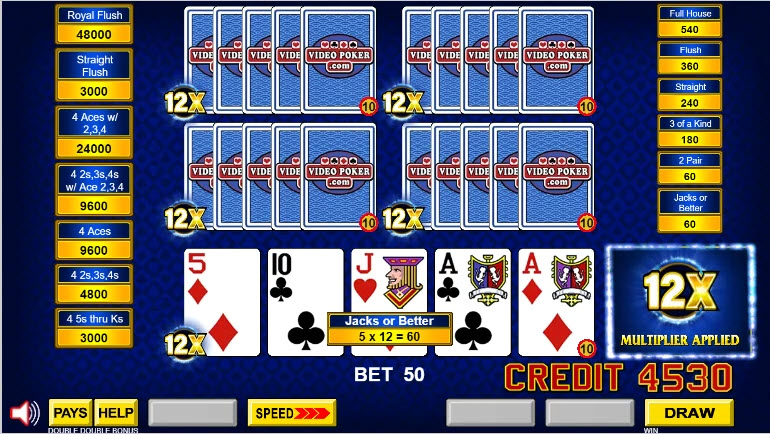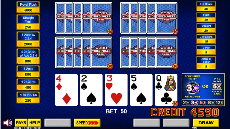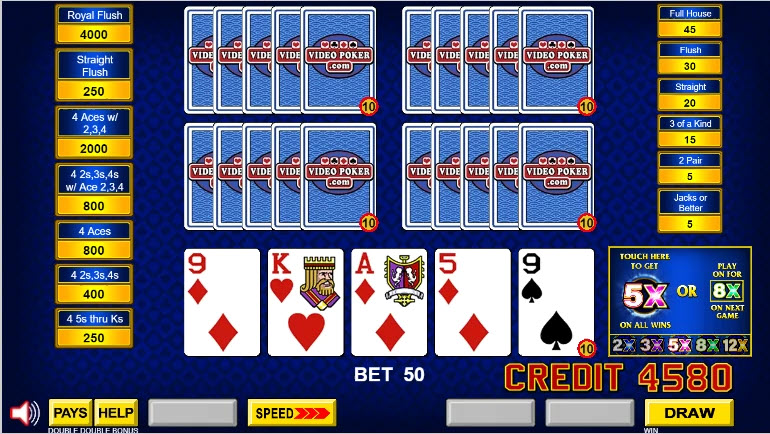 - إذا راهن اللاعب بمبلغ يتراوح بين 1 إلى 5 عملات معدنية لكل لعبة، فإن القواعد هي نفسها الموجودة في لعبة الفيديو بوكر التقليدية متعددة اللعب.