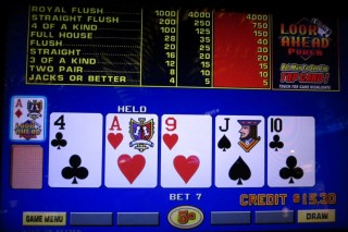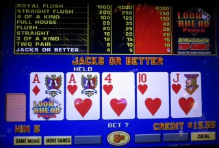 في لعبة فيديو بوكر التقليدية، اللعب الصحيح في هذه الحالة هو الاحتفاظ بالآس والولد. ومع ذلك، بما أنني أعلم أن الورقة التالية هي الآس الماسي، فسأختار الاحتفاظ بآس القلوب فقط.