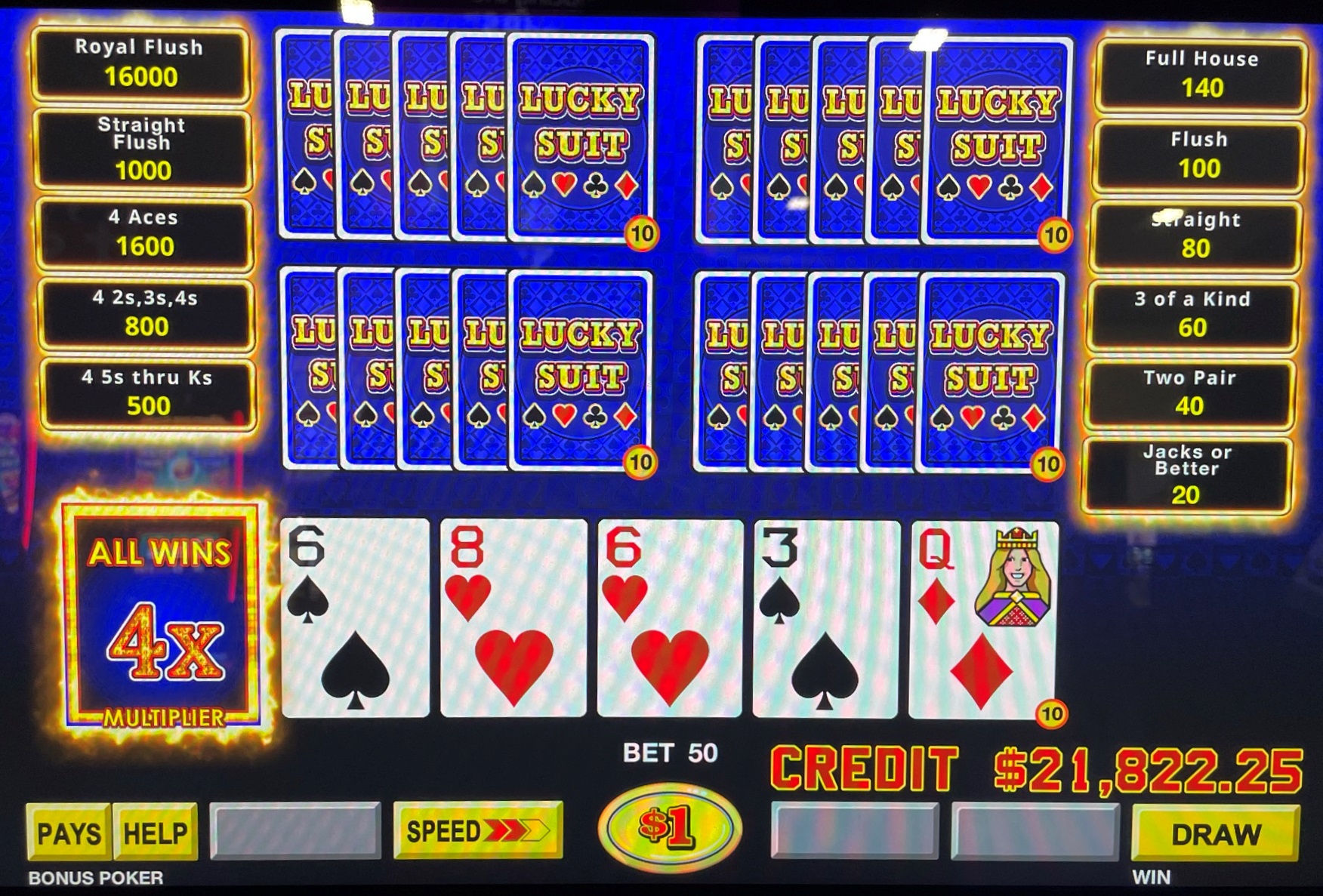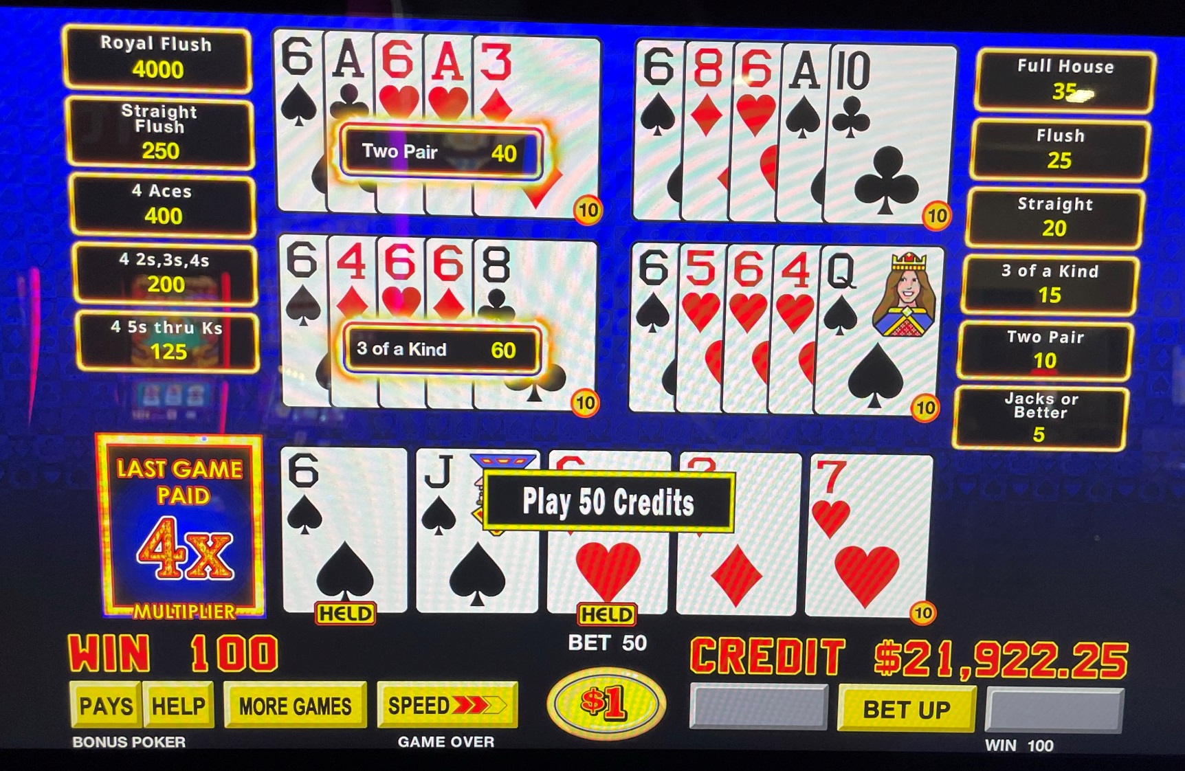 - إذا راهن اللاعب بمبلغ يتراوح بين 1 إلى 5 عملات معدنية في كل لعبة، فإن اللعبة تلعب مثل لعبة الفيديو بوكر التقليدية.