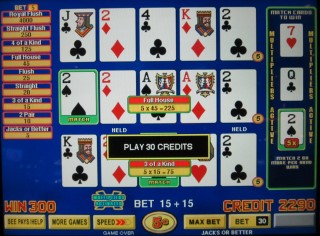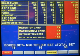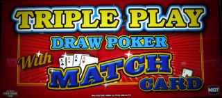 لاحظتُ لعبة "Triple Play Draw Poker" مع Match Card في كازينو Peppermill في رينو في يونيو 2013. تُشبه هذه اللعبة لعبة الفيديو بوكر، ولكن مع إضافة مميزة. بعد السحب، تختار اللعبة ثلاث بطاقات تُعرف باسم Match Cards من مجموعة أوراق منفصلة، دون احتساب أي بطاقات تخلص منها اللاعب. إذا تطابقت بطاقات Match Cards مع أي بطاقة في يد اللاعب بعد السحب، فسيربح مضاعفات. التكلفة هي أن اللاعب يجب أن يضاعف رهانه، وتعتمد الأرباح على نصف إجمالي الرهان فقط.