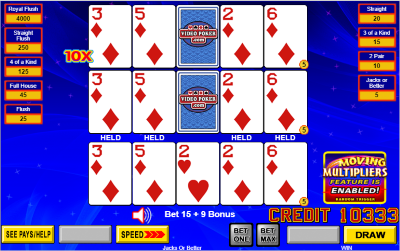 المضاعفات المتحركة هي نسخة من لعبة فيديو بوكر يُمكن إضافتها إلى ماكينات اللعب المتعدد التقليدية. مع رهان إضافي بثلاث عملات لكل خط، يُفعّل اللاعب ميزة المضاعفات المتحركة. تمنح هذه الميزة اللاعب مضاعفات عشوائية تتراوح بين 2x و12x.