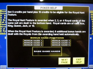 رأيتُ لعبة "رويال هانت" لأول مرة في كازينو صن كوست بلاس فيغاس في ديسمبر 2015. تُلعب اللعبة كبوكر فيديو تريبل بلاي التقليدي، مع رهان يصل إلى 15 رصيدًا. إذا راهن اللاعب بخمسة رصيد كاملة على الخطوط الثلاثة، يُمكنه تفعيل ميزة "رويال هانت" للحصول على 15 رصيدًا إضافيًا. في هذه الميزة، إذا حصل اللاعب على مجموعتين أو أربع أوراق رويال فلش عند توزيع الأوراق، سيحصل على ست أيدٍ إضافية عند السحب.