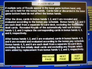 - لا يحتاج اللاعب إلى الاحتفاظ بالبطاقات الملكية لأيدي المكافآت الست. تُربح فورًا بعد التوزيع، بغض النظر عن طريقة لعبه.