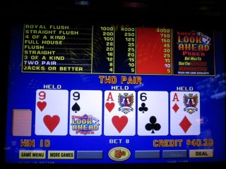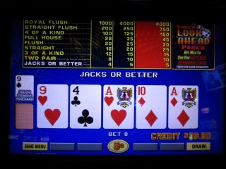 يمكن لأي مقامر محترف، أو محتال، أن يخبرك إذا كنت تعرف الورقة التالية التي سيتم توزيعها، مما يمنح اللاعب ميزة كبيرة. هذا بالضبط ما يُقال لك في لعبة Super Look Ahead Poker. بعد التوزيع، تُخبرك اللعبة بالورقة التالية التي سيتم توزيعها. يمكنك إما قبولها أو حرقها. للأسف، شركة IGT ليست بهذه الحماقة التي تُقدم هذه المعلومات مجانًا. فهي تُكلف ثلاث عملات إضافية بالإضافة إلى العملات الخمس المعتادة، مما يُساعد أيضًا على رفع جدول الأرباح قليلًا. فيما يلي القواعد الكاملة.