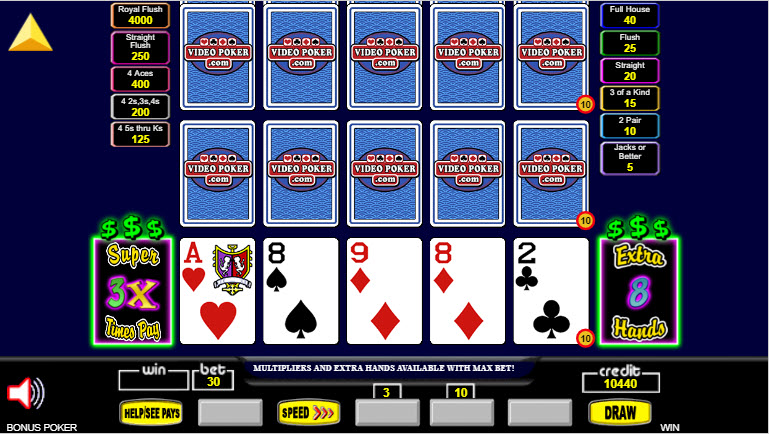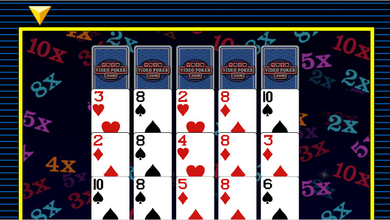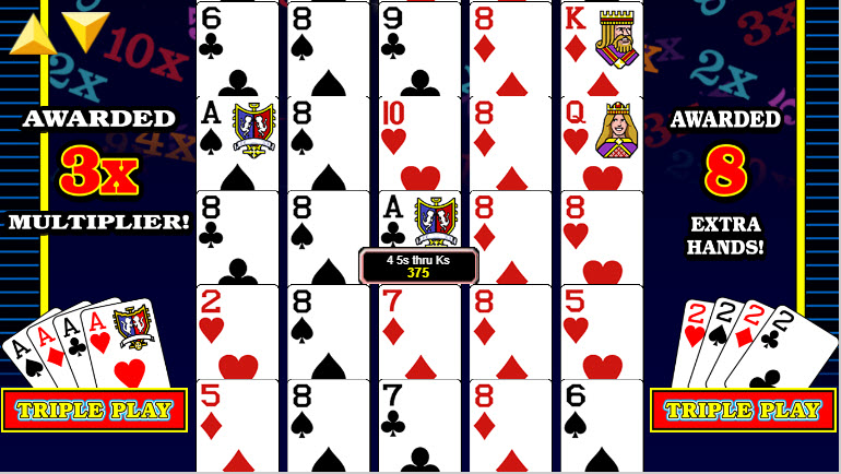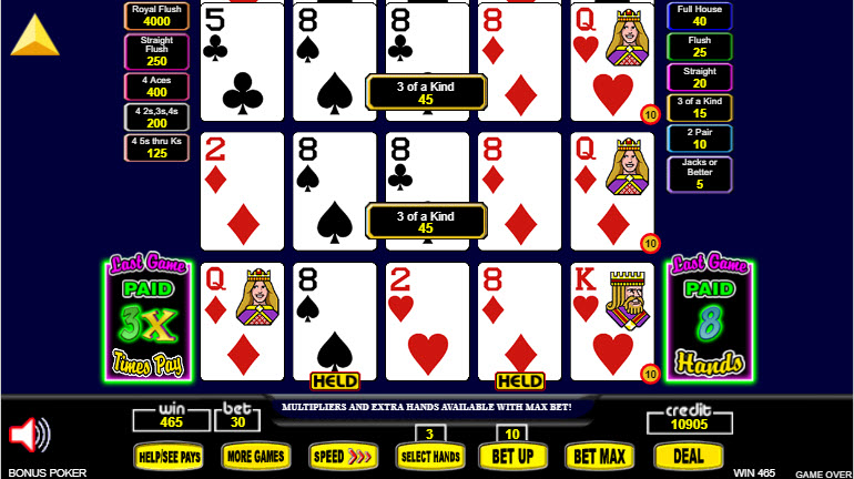 في الصورة أعلاه، كنت ألعب بوكر المكافأة بثلاثة لاعبين. كانت الميزة مُفعّلة، مما منحني مضاعفًا ثلاثة أضعاف وثماني أيادٍ إضافية، ليصبح المجموع ١١ يدًا. سأختار الاحتفاظ بزوج الـ ٨.