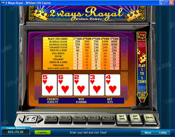 لعبة "2 Ways Royal/Split Way Royal" هي لعبة فيديو بوكر متوفرة في بعض كازينوهات Playtech وBetsoft على الإنترنت. تعتمد اللعبة على ربح 2-6 أوراق متتالية، وهو نفس ربح أوراق "Royal Flush"، أي 800 ضعف، بناءً على الحد الأقصى للرهان.