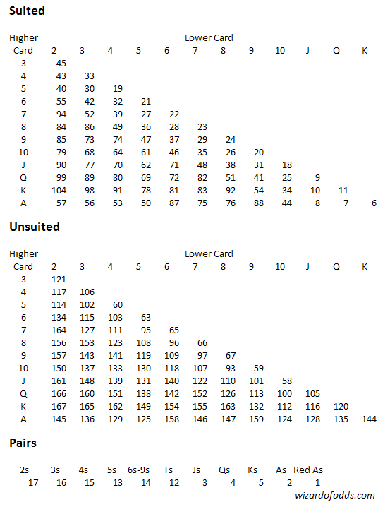 يوضح الجدول التالي تصنيف جميع فئات أوراق اللعب ذات البطاقتين، ضمن جدول الدفع 6 في لعبة سوبر فيديو هولدم. لأي زوج من أوراق اللعب الأولية ذات البطاقتين، ابحث عن تصنيف قوة كل منهما. ثم العب اليد ذات التصنيف الأعلى (أو الأقل). تذكر أن أوراق اليد الملغاة تُعاد إلى المجموعة، فلا داعي للقلق بشأن استثناءات أوراق اللعب . يوضح عمود القيمة المتوقعة متوسط الفوز لتلك اليد. يوضح عمود الاحتمالية احتمالات فوزك ولعبك لتلك اليد. عمود العائد هو حاصل ضرب الاحتمالية والعائد المتوقع. مجموع العائدات هو العائد للعبة بأكملها، وهو 98.14%.