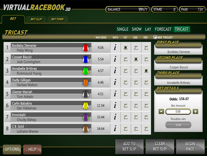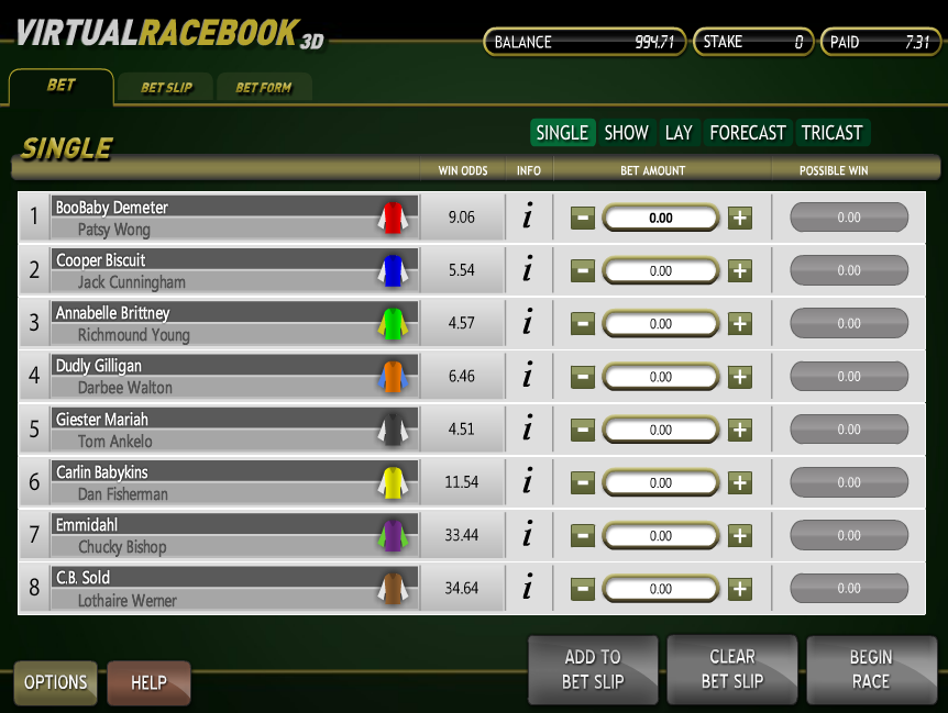 Virtual Racebook 3D هي لعبة سباق خيول من Betsoft . تتميز اللعبة بخمس طرق مختلفة للمراهنة وتجربة سباق واقعية للغاية.
