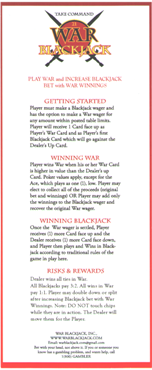 رأيتُ لعبة بلاك جاك الحرب لأول مرة في كازينو داون تاون جراند بلاس فيغاس في 9 مايو 2014. قيل لي إنها كانت موجودة بالفعل في كازينو كارسون سيتي ناجيت ويوريكا في ميسكيت آنذاك. اللعبة مزيج من لعبة بلاك جاك الحرب. المثير للاهتمام هو أنه إذا فاز اللاعب برهان الحرب، فيمكنه إضافة قيمة الفوز إلى رهان البلاك جاك، وهو يعلم مُسبقًا ورقته الأولى وورق الموزع المكشوف.