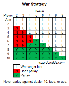 يوضح الجدول التالي القيمة المتوقعة لرهان البلاك جاك، بناءً على بطاقة اللاعب الأولى وبطاقة الموزع المكشوفة، في حال رهان "حرب" فائز فقط. يعتمد الجدول على رزم لا نهائية، حيث يحصل الموزع على 17 ناعمة، ويُسمح بالمضاعفة بعد التقسيم، ويُسمح بالاستسلام. تعني "الخسارة" في الجدول أن اللاعب خسر رهانه، وبالتالي لا يملك خيار المراهنة المجمعة. يجب على اللاعب المراهنة المجمعة برهان "حرب" فائز في أي حالة ذات قيمة متوقعة إيجابية.