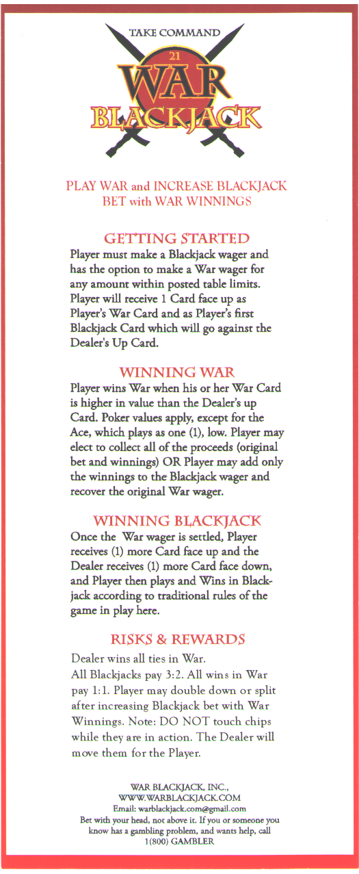 رأيتُ لعبة بلاك جاك الحرب لأول مرة في كازينو داون تاون جراند بلاس فيغاس في 9 مايو 2014. قيل لي إنها كانت موجودة بالفعل في كازينو كارسون سيتي ناجيت ويوريكا في ميسكيت آنذاك. اللعبة مزيج من لعبة بلاك جاك الحرب. المثير للاهتمام هو أنه إذا فاز اللاعب برهان الحرب، فيمكنه إضافة قيمة الفوز إلى رهان البلاك جاك، وهو يعلم مُسبقًا ورقته الأولى وورق الموزع المكشوف.