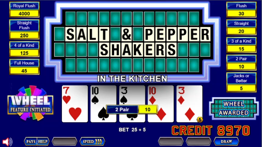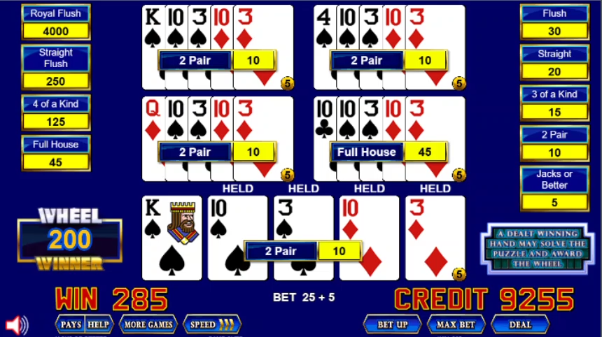 في هذه اللعبة، احتمال حل اللغز، بشرط أن تكون يد اللاعب رابحة عند التوزيع، هو 0.090118. واحتمال الحصول على يد رابحة في أي لعبة تعتمد على "جوكر وايلد" أو "ملوك أو أفضل" هو 0.195845. متوسط دوران العجلة في أي لعبة من 10 لعبات هو 276.660129. هذا يجعل قيمة الفوز المتوقع للرهان الجانبي تساوي احتمال (اليد الرابحة عند التوزيع) × احتمال (حل اللغز) × متوسط جائزة العجلة = 0.195845 × 0.090118 × 276.660129 = 4.882815.