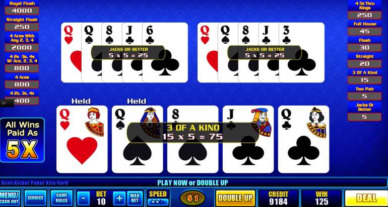 - إذا راهن اللاعب بمبلغ يتراوح بين 1 إلى 5 نقاط ائتمان لكل لعبة، فسيتم لعب اللعبة مثل لعبة فيديو بوكر التقليدية.