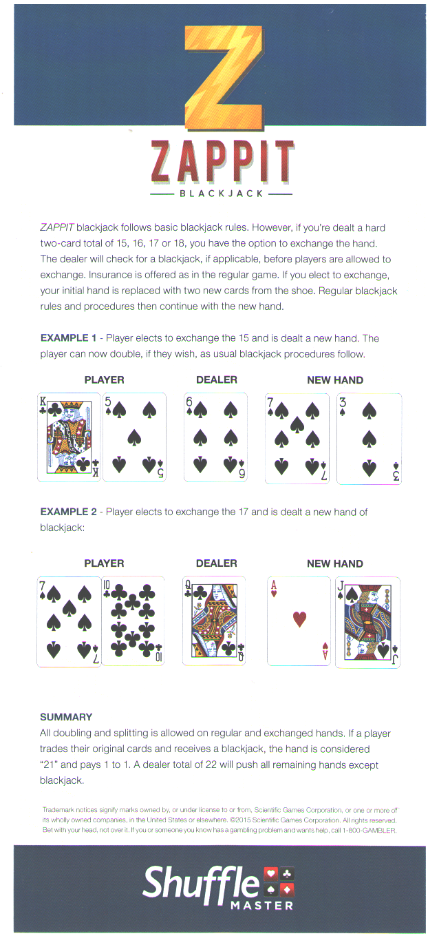 يعتمد Zap It على قواعد البلاك جاك التقليدية، والتي أعتقد أن القارئ على دراية بها. وكما هو الحال في البلاك جاك، بعض القواعد قابلة للتخصيص، لكن القاعدتين الأساسيتين لـ Zappit هما: