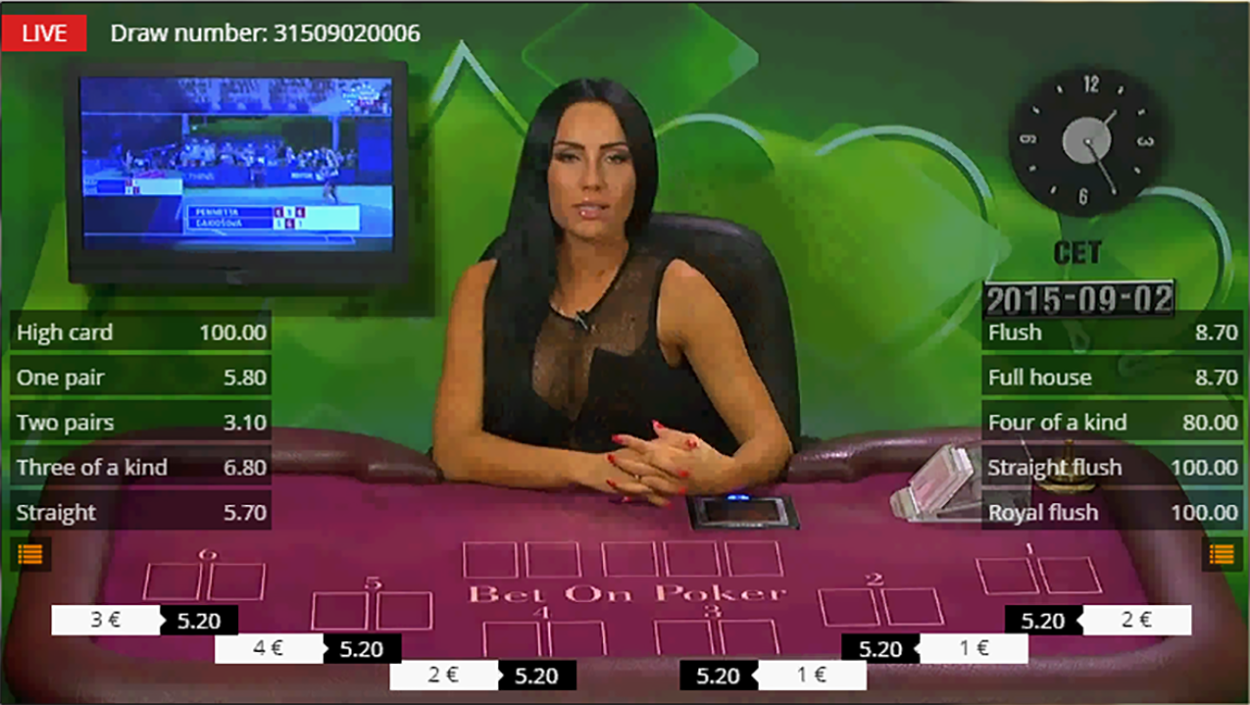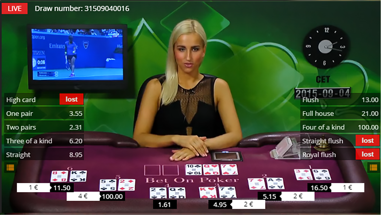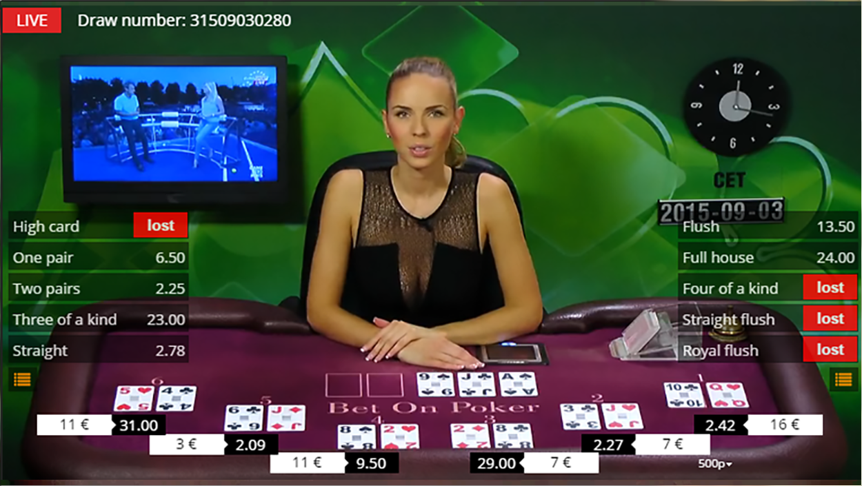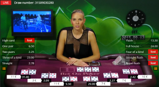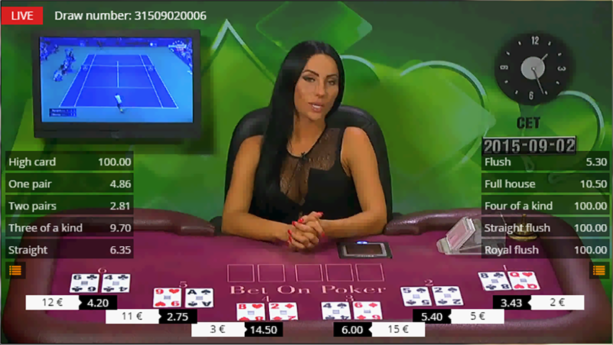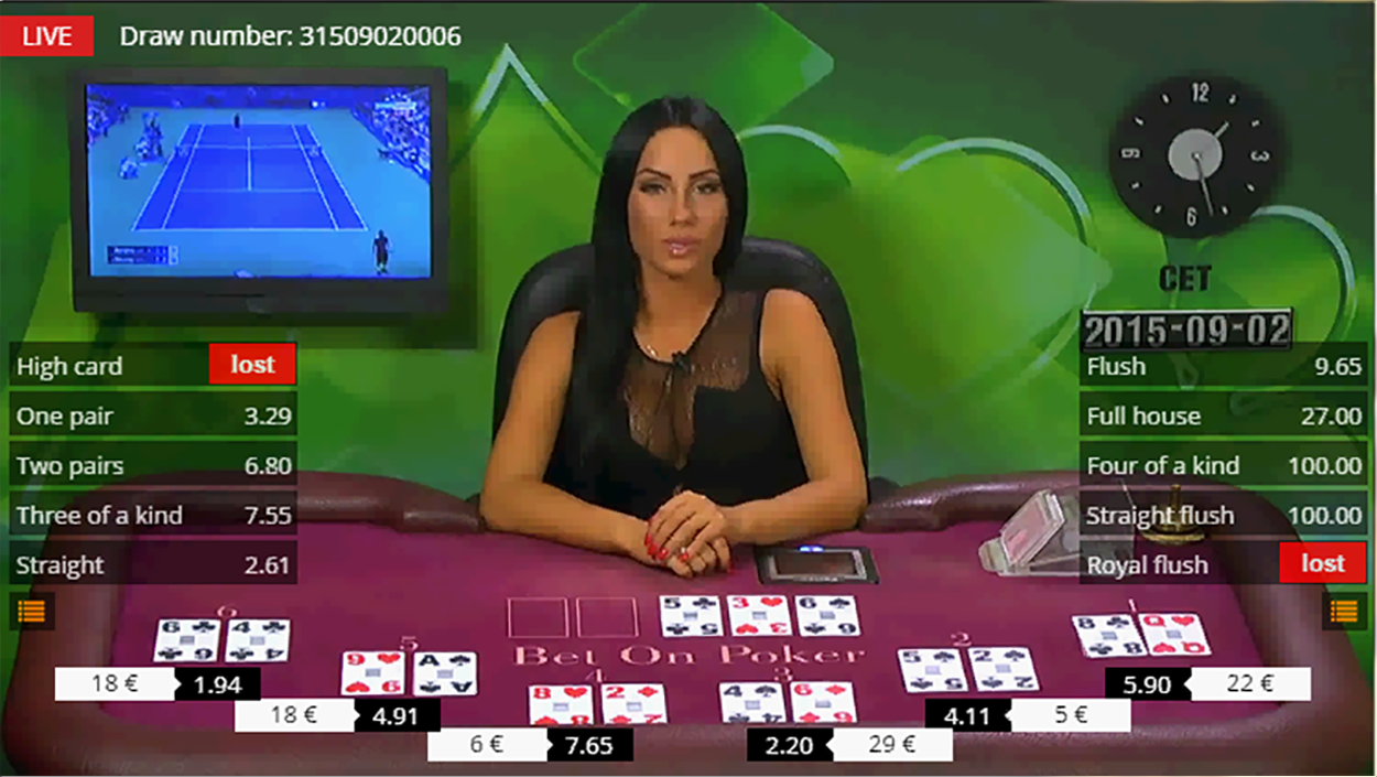 العلامات التجارية للموزع المباشر التي رأيت الرهان على لعبة البوكر فيها هي Bet Construct و BetGames و TvBet .