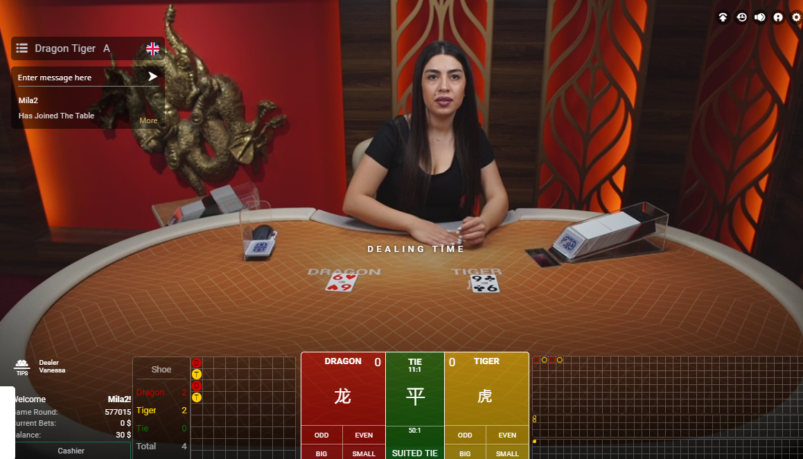 يقدم Oriental Game لعبة Dragon Tiger بسيطة بثلاثة رهانات رئيسية فقط. أكثر ما يعجبني في هذا الاستوديو هو ملابس الموزعين. الطاولة مكتوبة باللغة الصينية، لذا لا أستطيع تحديد قيمة رهان التعادل.