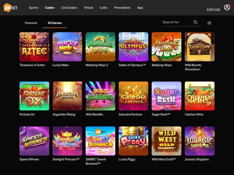 كازينو 188Bet مدعوم بـ Microgaming, Playtech, Big Time Gaming, Evolution Gaming, Habanero Systems, Play'n GO, Pragmatic Play, Nolimit City, Red Tiger Gaming, Skillzzgaming, Triple Edge Studios, Stormcraft Studios, Switch Studios, Pocket Games Soft, All41 Studios, Gameburger Studios, Neon Valley Studios, SpinPlay Games, Buck Stakes Entertainment, Games Global, 2by2 Gaming, Foxium, Just For The Win, Storm Gaming Technology, PearFiction Studios, Wild Streak Gaming, Slingshot Studios, Fortune Factory Studios, Alchemy Gaming, Rarestone Gaming, Snowborn Games, Aurum Signature Studios, Leap Gaming and PlayAce ، الذي يوفر مئات الألعاب عبر منصته الإلكترونية. يمكن للاعبين أيضًا الوصول إلى الكازينو عبر أجهزتهم المحمولة، مع أن مكتبة الألعاب ليست كبيرة.
