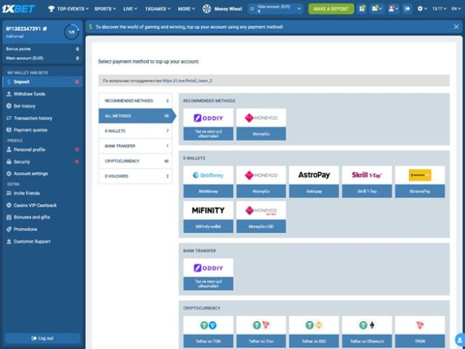 النظام المصرفي في 1XBET رائع، حيث يُتيح الموقع إيداعًا وسحبًا باستخدام المحافظ الإلكترونية وبطاقات الائتمان. سرعة السحب ممتازة، حيث تُصرف الأموال خلال 15 دقيقة. كما أن السحب بدون حد أقصى، وهو أمر رائع.