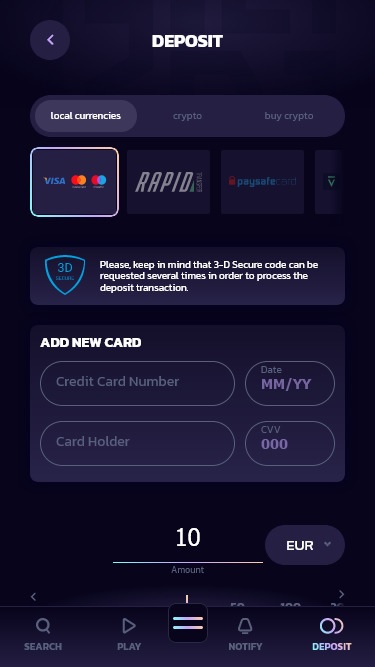 فيما يتعلق بطرق الدفع، ستتمكن منإيداع أموالك بمجموعة متنوعة من العملات المشفرة . بالإضافة إلى إيداع العملات المشفرة، يمكنك أيضًا اختيار الإيداع باستخدام خيارات شائعة مثل Neteller وVisa وMastercard وJeton وMuchBetter وMifinity.