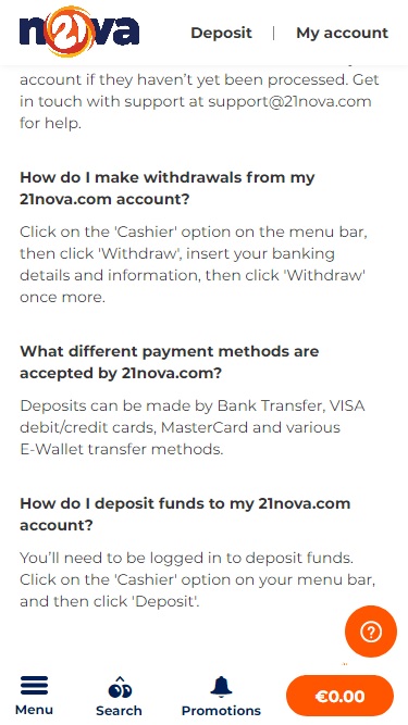تجد معلومات عن المقامرة المسؤولة في أسفل صفحة الكازينو، حيث يوفر الموقع معلومات حول تحديد إدمان القمار ومكافحته. يوفر الموقع حدودًا مختلفة، مثل اختبارات الواقع، ووقت الاستراحة، وحدود اللعب، وحدود الإيداع، والاستبعاد الذاتي. كما تتوفر روابط لمجموعات مساعدة إدمان القمار.فريق الدعم في 21nova متاح على مدار الساعة عبر الدردشة المباشرة والبريد الإلكتروني. كان الممثل الذي تحدثت معه بشأن شروط المكافآت ودودًا، وتمكن من إعطائي الإجابات التي أحتاجها بسرعة. أُقيّمهم بمتوسط مستوى تقريبًا مقارنةً بالكازينوهات الأخرى التي تعاملت معها.