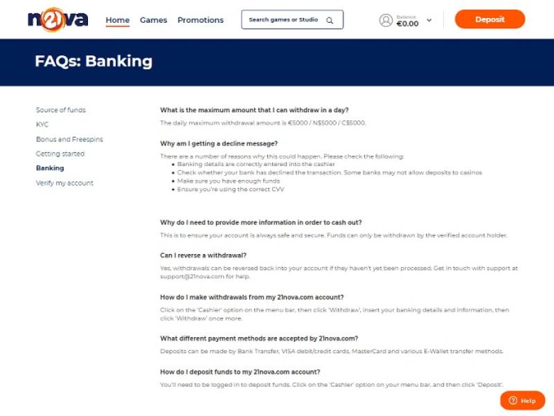 إن الشروط والأحكام في 21nova هي أكثر أو أقل قياسية، مع الصياغة التي قرأتها لا تبرز حقًا على أنها غير عادلة أو استغلالية تجاه اللاعبين.ستجد هنا خيارات الخدمات المصرفية المتنوعة في كازينو 21nova، بما في ذلك خيارات الإيداع والسحب المختلفة.